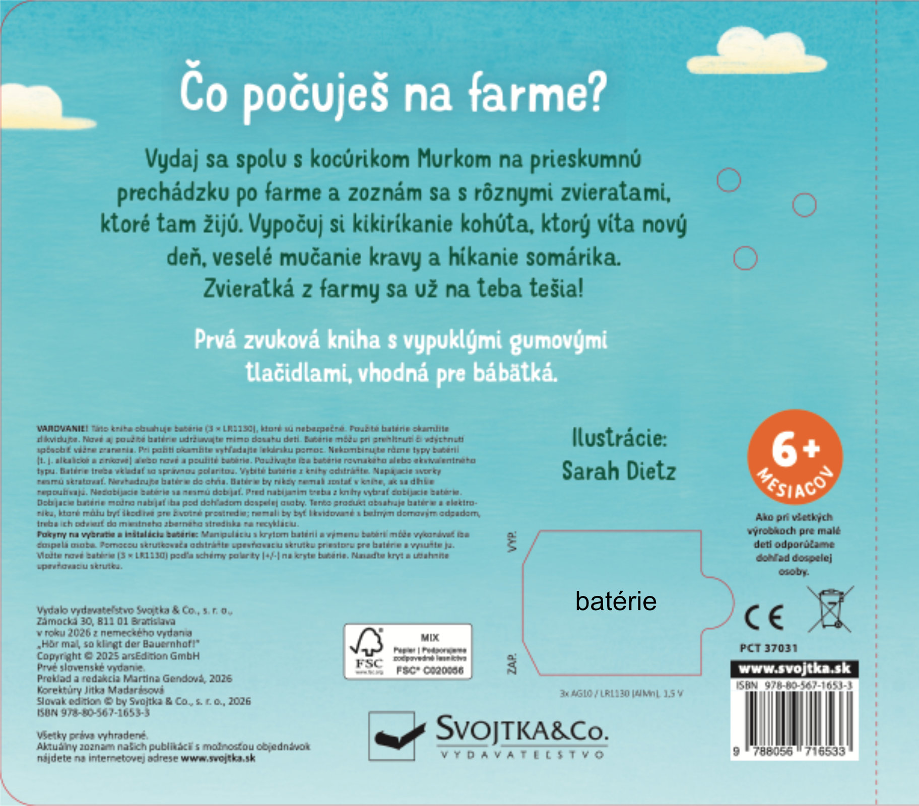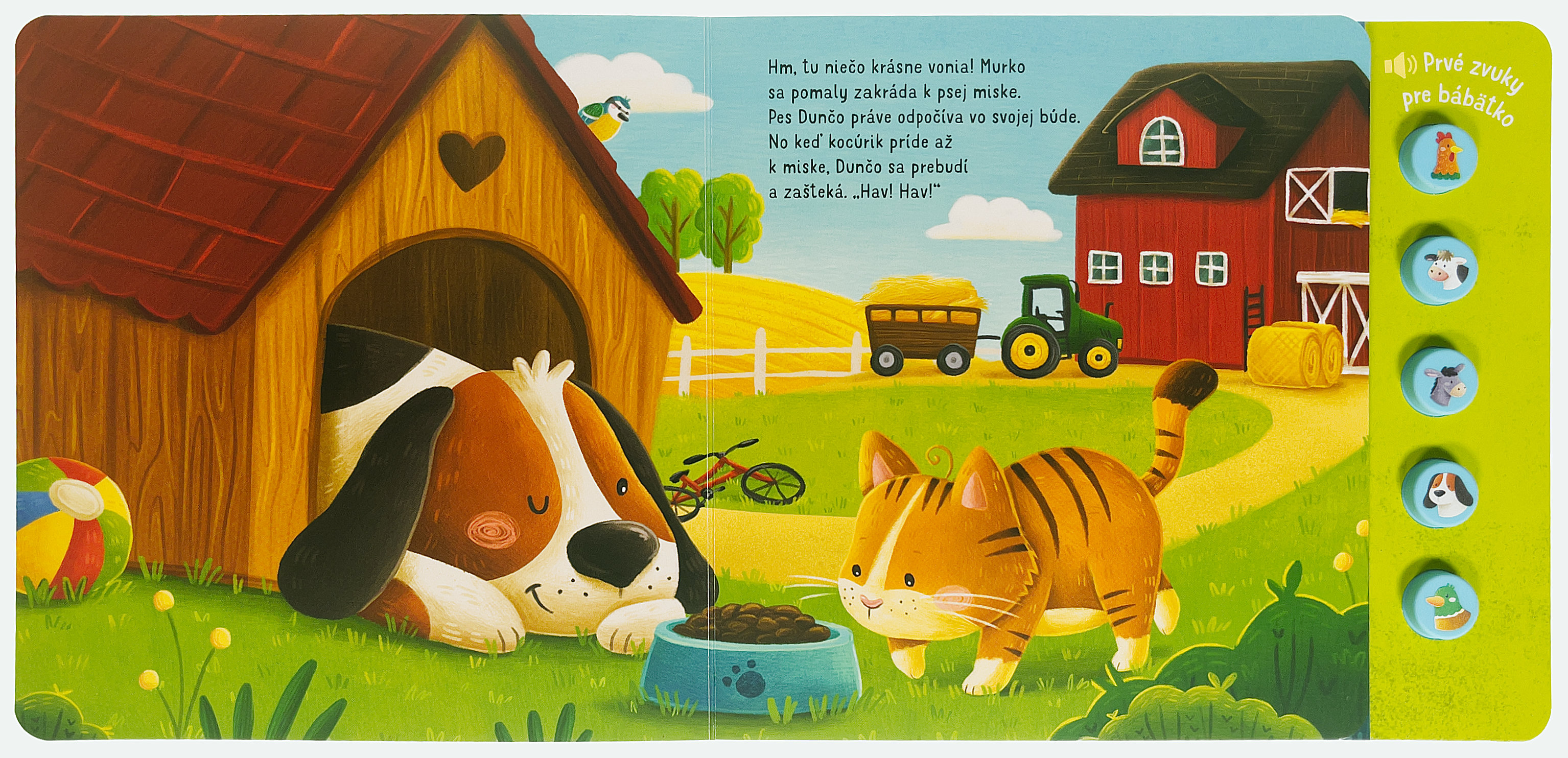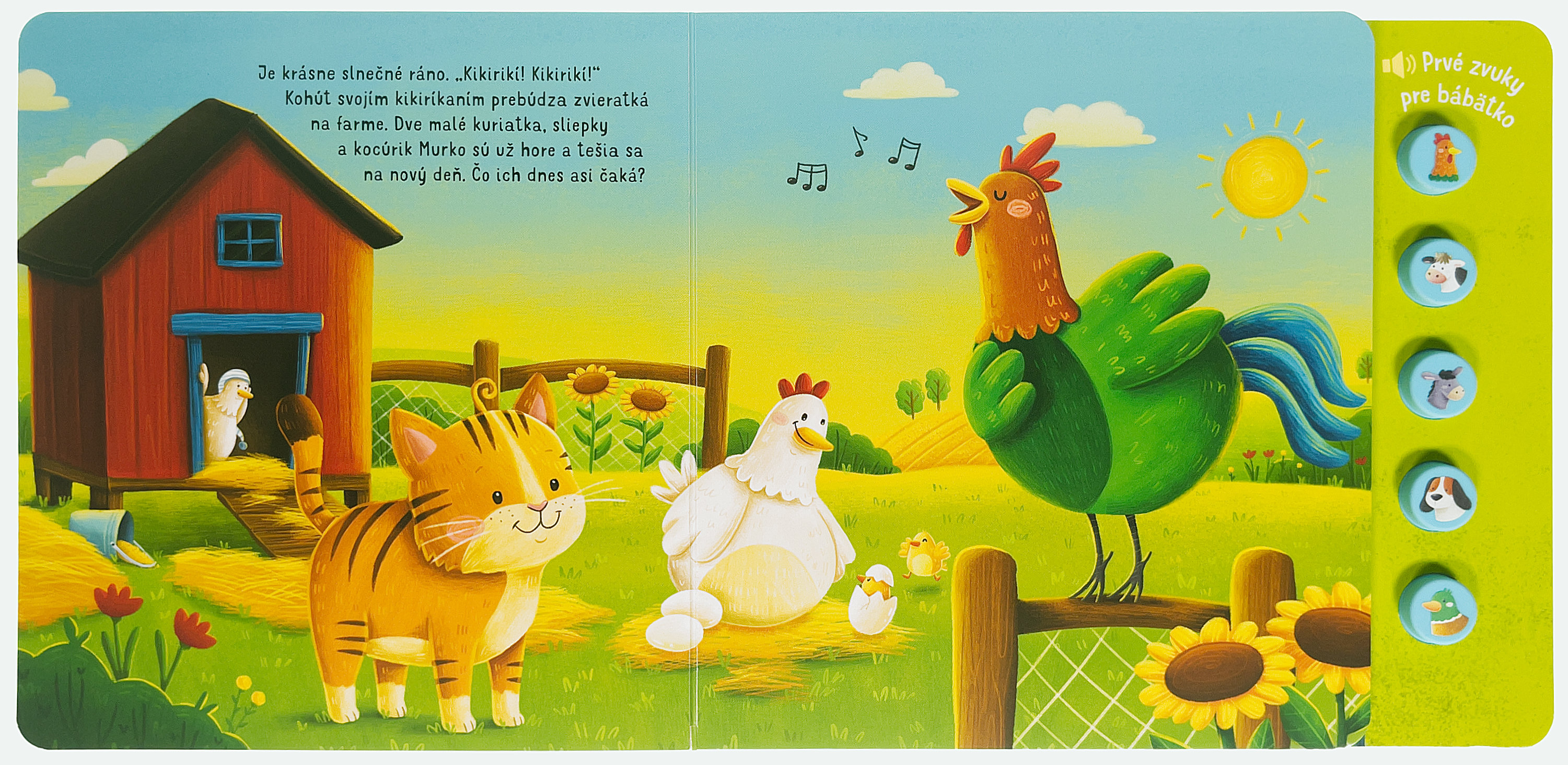 Vydaj sa spolu s ryšavým kocúrikom na prieskumnú prechádzku po statku a zoznám sa s rôznymi zvieratami, ktoré tam žijú. Vypočuj si kikiríkanie kohúta vítajúceho nový deň, veselé bučanie kravy a híkanie oslíka. Zvieratká zo statku sa na teba tešia! Vďaka vystúpeným gumovým tlačidlám a roztomilým ilustráciám s jednoduchým príbehom je kniha vhodná aj pre najmenšie deti.Počet strán: 12