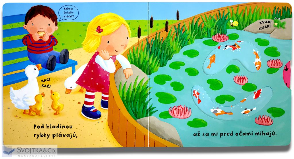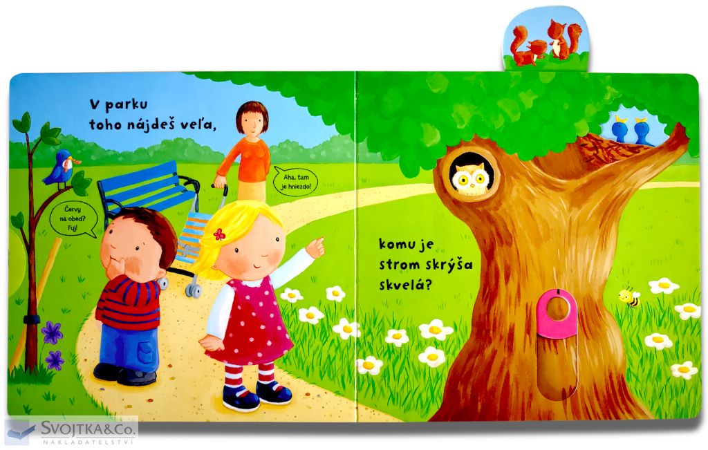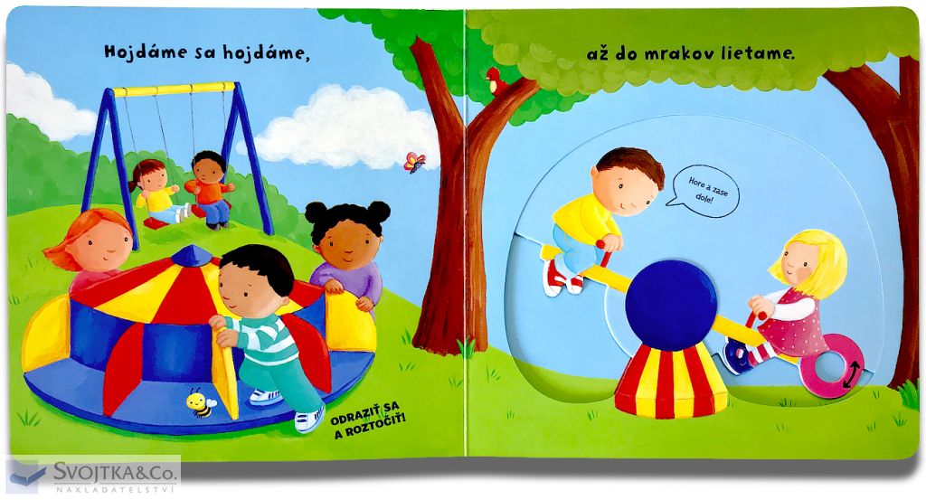 Zaujíma ťa, čo sa deje v parku? Pohojdaj sa na hojdačke! Zisti, kto sa rád schováva vo strome! Pozri, plávajú v jazierku rybky? Toto leporelo je určené pre deťom od jedného roka. Má pevné stránky s posuvnými a otočnými prvkami, a tak si dieťa pri prezeraní knižky súčasne precvičí jemnú motoriku – môže na jednotlivých stránkach posúvať, ťahať, otáčať. Objaví nové veci a môžete sa o nich spoločne rozprávať! Tak rýchlo, v parku sa deje toľko vecí!
