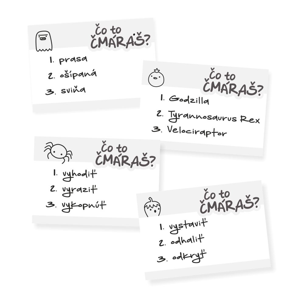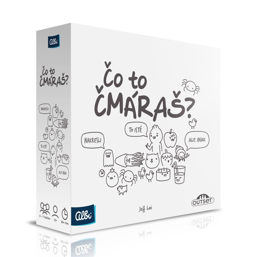 Dokážete nakresliť stíhačku? Samozrejme že áno! Ale čo keď niektorý z hráčov kreslí susedku od vedľa, zatiaľ čo ostatní kreslia lietadlo? S párty hrou Čo to čmáraš? sa zaručene pobavíte. V hre vôbec nezáleží na tom, či viete dobre kresliť, či nie. Podstatný je dobrý nápad a bystrý odhad. HERNÝ MECHANIZMUS: Náhodne si vylosujete číslo 1, 2 nebo 3 a vašou úlohou bude nakresliť zodpovedajúci pojem z karty (napr. 1. stíhačka, 2. tryskáč, 3. lietadlo). Potom musíte tipovať čo kreslili ostatní hráči. Body získavate za správne hádanie. Ale aj za to, keď váš obrázok uhádne niekto iný. OBSAH HRY: 137 kariet so slovami 63 farebných žetónov s číslami 9 čiernych žetónov s číslami 7 prehľadových kariet 7 ceruziek Presýpacie hodiny Pravidlá hry v slovenčine PARAMETRE PRODUKTU: Rozmery krabice: 20,5 cm x 20,5 cm x 6 cm
