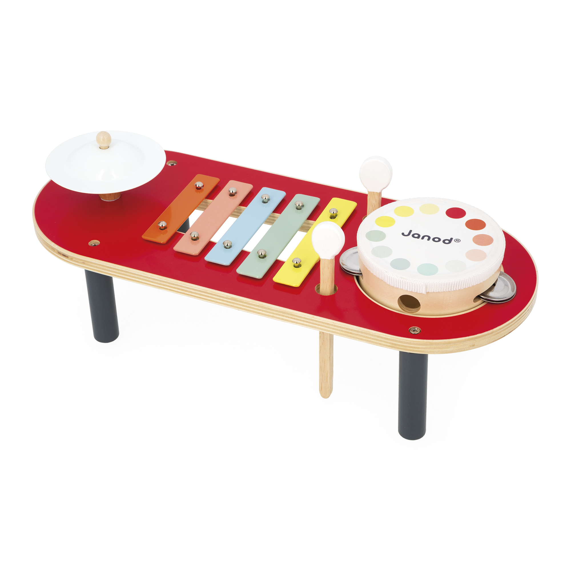 Koncert sa môže začať! S týmto farebným hudobným stolíkom si najmenší budú môcť vymýšľať tú najkrajšiu hudbu. Obsahuje činel, bubon a xylofón. Praktické: Paličky sa dajú uložiť do otvorov na stole! Ideálna hračka na hranie, ktorá bude vaše dieťa sprevádzať pri hudobnom učení a objavovaní zvukov. Drevená hračka s certifikátom FSC. Pre deti od 18 mesiacov.