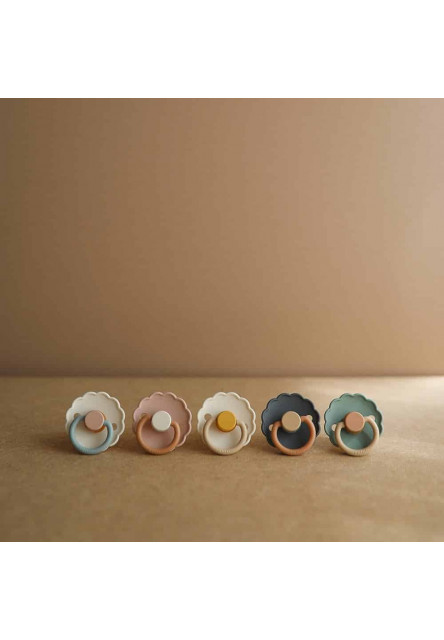 Cumlíky sú vyrobené z prírodného kaučuku, pričom ich tvar je zakrivený jemne smerom von, aby sa zabránilo podráždeniu pokožky. Každý cumlík je strojovo testovaný na závadnosť, aby sa k našim najdôležitejším zákazníkom dostal vždy perfektný produkt. Pre väčšiu bezpečnosť sú v štíte prítomné vzduchové otvory. FRIGG je 100% dizajnovaný a vyrobený v Dánsku ako jediná značka cumlíkov na svete! Každý cumlík je zároveň vyrobený na princípe zero-waste, čím sa minimalizuje odpad materiálu vďaka možnosti recyklácie. Cumlíky sú vyrábané s maximálnym ohľadom na životné prostredie, a zároveň s dôrazom na uspokojenie potrieb najmenších detí. FRIGG kladie dôraz aj na bezpečnosť - cumlíky sú vyrábané bez BPA, PVC a ftalátov, každý cumlík podstupuje stretch a vacuum test pred uvedením do predaja a sú vyrábané podľa najprísnejšej normy EN1400-A2. Spoznajte svet značky FRIGG, inšpirovaný bohyňou zeme, vzduchu a plodnosti podľa severskej mytológie a nechajte sa zlákať dokonalosťou tvarov a farieb. Cumlíky FRIGG Daisy s vrúbkovanými okrajmi, ktoré napodobňujú lupene kvetov, sú základom elegantného dizajnu. Kvetinové a moderné detaily upútajú pozornosť každej štýlovej mamičky. Vďaka tomu sa FRIGG perfektne hodí pre dnešné matky, ktoré pri výbere základných potrieb pre bábätko prikladajú veľký význam klasickému dizajnu s modernými prvkami. Vlastnosti: - 100% navrhnuté v Dánsku - 100% vyrobené v Dánsku - každý cumlík musí prejsť naťahovacím a vákuovým testom - materiál štítu: Polypropylén (PP) - bezpečnostná norma: EN1400 + test A2 Podrobnosti o kaučukových cumlíkoch veľkosti 1: - materiál: 100% prírodný kaučuk - veľkosť: 27 mm - odporúčaný vek: 0-6 mesiacov