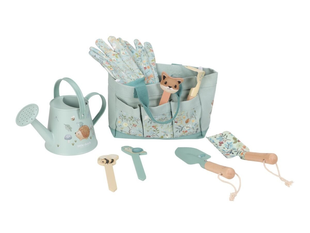 10-dílná sada nářadí v krásném provedení obsahuje vše, co malá zahradnice či zahradník potřebují: konvičku na zalévání, zahradnické rukavice, dvě lopatky a hrabičky v kvalitním provedení z odolného kovu s dřevěnou rukojetí a tři zapichovací dřevěné jmenovky. Vše je uloženo v praktické pevné tašce z bavlněného plátna s množstvím kapes pro přehledné ukládání a snadné přenášení. Nářadí i taška jsou zdobené krásným potiskem motivů ze života v lese.