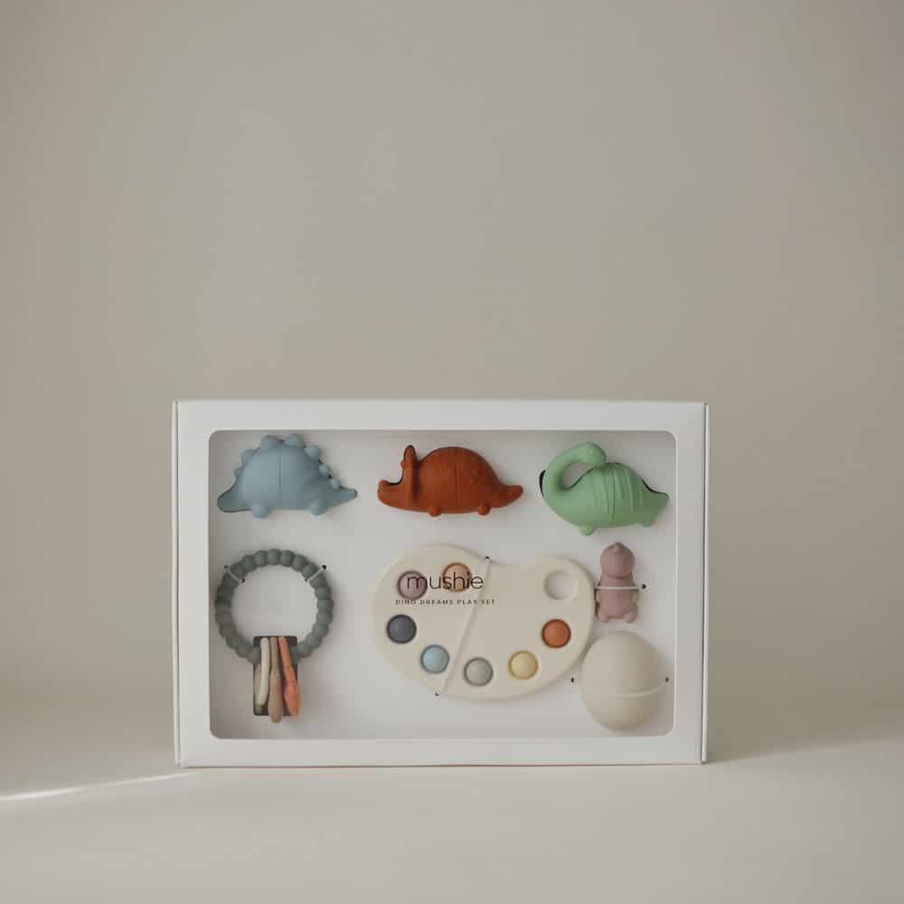 Pokyny na starostlivosť – Mushie Dino Dreams Play Set Umývajte teplou vodou a jemným mydlom, nechajte voľne uschnúť. Všetky silikónové časti je možné umývať v hornom koši umývačky riadu. Na sterilizáciu hryzátka ho varte 5 minút. Vyhnite sa agresívnym alebo parfumovaným čistiacim prostriedkom.