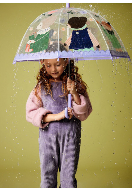 Detský palicový dáždnik z priehľadného plastu s jemnými ilustráciami zvieratiek na prechádzke v daždi. Okraj dáždnika je obšitý textilným lemom a k jednotlivým plastovým koncovkám pripevnený niťou. Kostra dáždnika je plastová, spevnená skleným vláknom, vďaka čomu je ľahká a pevná zároveň. Stredová tyč je kovová s matnou plastovou rúčkou. Dáždnik sa otvára/zatvára manuálne, jednoduchým a bezpečným roztvorením/stiahnutím bez zaseknutia prstov.