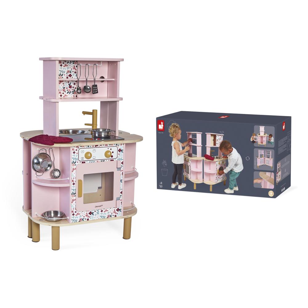 Tento týden se jedná o děti, které pozývají krásnou dvojitou dřevěnou kuchyni, která je otevřena pro celou rodinu! Jarní barvy, moderní a módní styl a další možnosti pro hru, protože se otevírá podél své délky... ideální dětská kuchyně, která si hraje s ostatními nebo se stane mistrem v umění vaření! Tato kuchyně umožní vašemu dítěti vymyslet mnoho příběhů mezi kuchyňským kouttem na jedné straně, pračkou na druhé a její magické straně poté, co se šíří! Je chytře vybaven kovovým dřezem, dřevěnou baterií a indukční varnou deskou se zvukem a světlem. Jednou stiskněte červená tlačítka jednou a rozsvítí destičky a potom podruhé uslyšíte zvuk vroucí vody. Zvukové a světelné efekty jsou automaticky vypnuty po 30 sekundách nebo po třetím tlačítku. Otočení trouby a pračky nemůže být snazší, obě jsou vybaveny dvěma otočnými knoflíky se zvukovými efekty. Dveře jsou magnetické a průhledné sklo vám umožňuje zjistit, zda pračka vzala! 4 posuvné dveře umožňují skladování dortů a dalších dobrot. Uvnitř kuchyně jsou další 2 skříně pro skladování nástrojů a další příslušenství. Existují také atraktivní kovové věšáky pro zavěšení otáčení a naběračky! S touto kuchyní je dodáno celkem 8 kusů příslušenství: 1 pánev, 1 kastrol, 1 ciddle, 1 lopatka, 1 otáčení, 1 sběratel s otvory, 1 polévkovou lžíci pro špagety a 1 tkanin pro hrnec. Pro další bezpečnost je kuchyně zajištěna elastickým popruhem, který je ideální pro přepravu. Do kuchyně jsou dodávány polštářky pro ochranu nohou a podlahy. Díky této pěkné kuchyni budou vaše děti schopny pobavit hodiny, samotné nebo s ostatními a vytvořit nejkrásnější malá jídla pro radost celé rodiny! Výška pracovní desky: 50 cm. Hračka pro děti od 3 let.