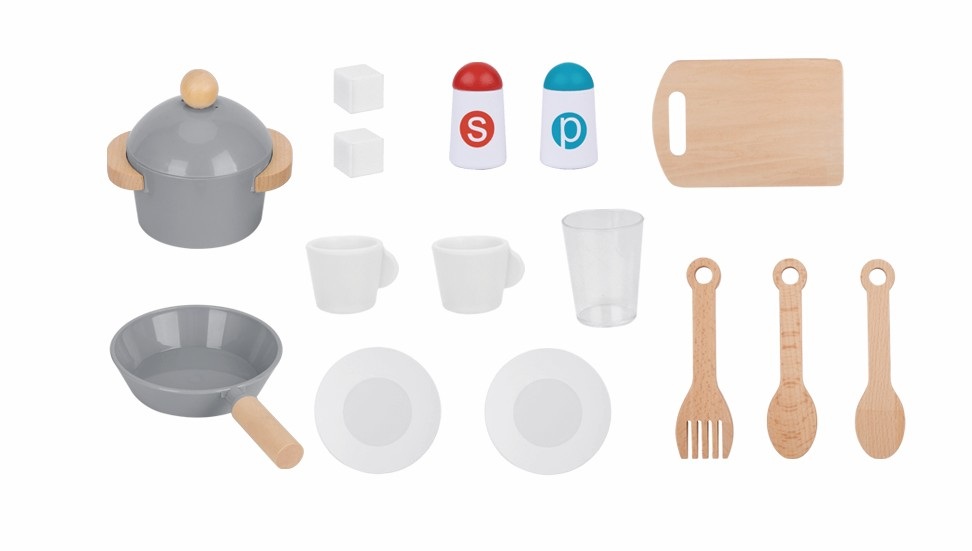 Táto veľká detská kuchynka je ideálnou hračkou pre všetkých malých kuchárov a kuchárky, ktorí milujú varenie a chcú objavovať svet kulinárskych dobrodružstiev. Moderný dizajn v elegantnej kombinácii šedej farby a zlatých doplnkov dopĺňajú realistické spotrebiče a bohaté príslušenstvo, ktoré deťom umožní rozvíjať kreativitu, samostatnosť a hru na role.Kuchynka má pevnú konštrukciu v tvare obdĺžnika a nemožno ju výškovo nastavovať. Na bočných stranách sú praktické otvory pre ľahké nadvihnutie a premiestnenie celej kuchynky. Deti tu nájdu varnú dosku so svietiacimi platničkami, ktoré je možné zapínať a vypínať, a tiež cvakavé otočné gombíky, ktoré dodávajú hre reálny zvukový efekt.Súčasťou kuchynky je mikrovlnná rúra s otváracími dvierkami (tlačidlá sú iba dekoratívne), rúra na pečenie a umývačka riadu, ktoré fungujú ako úložné skrinky. Nechýba ani kávovar, drez s otočným kohútikom a priestranná chladnička s funkčným výrobníkom ľadu. Po vložení dvoch kociek ľadu do hornej časti stačí priložiť pohárik spredu a zatlačiť ho smerom dozadu a ľadové kocky naozaj spadnú dovnútra, čo je obľúbená funkcia všetkých detí.Kuchynka je doplnená bohatým príslušenstvom, ktoré zahŕňa hrniec s pokrievkou, panvičku, doštičku, kuchynské náčinie v podobe 3 kusov varečiek, 2 tanieriky, 2 hrnčeky, pohár, soľničku, koreninu, dve kocky „ľadu“ a hodiny s otočnými ručičkami. Vďaka tomu majú malí kuchári všetko potrebné na prípravu i servírovanie svojich kuchárskych výtvorov. Hlavné vlastnosti: cvakavý zvuk pri otáčaní gombíkovsvietiace platničky varnej dosky (možno zapnúť/vypnúť)otváracie dvierka spotrebičovfunkčný výrobník ľadu s dvoma kockamibohaté príslušenstvo pre hru na varenierôzne odkladacie a úložné priestorymoderný dizajn v šedej farbe so zlatými doplnkamirozvíja kreativitu, sociálne zručnosti a dlhotrvajúcu hru na rolevyrobené z FSC® certifikovaného dreva2xAA batérie nie sú súčasťou balenia Značka a certifikát FSC® (Forest Stewardship Council) zaručuje, že drevo, z ktorého bol výrobok vyrobený, nebolo vyťažené nelegálne a pochádza z lesov obhospodarovaných šetrným či prírode blízkym spôsobom, v ktorom sú dodržiavané prísne environmentálne a sociálne požiadavky. Značka FSC® na výrobku znamená, že svojim nákupom pomáhate chrániť lesy a podporujete šetrné, zodpovedné či prírode blízke hospodárenie, vďaka ktorému sú naše lesy stabilnejšie, zdravšie, majú prirodzenú druhovú skladbu a lepšie odolávajú negatívnym následkom klimatických zmien.