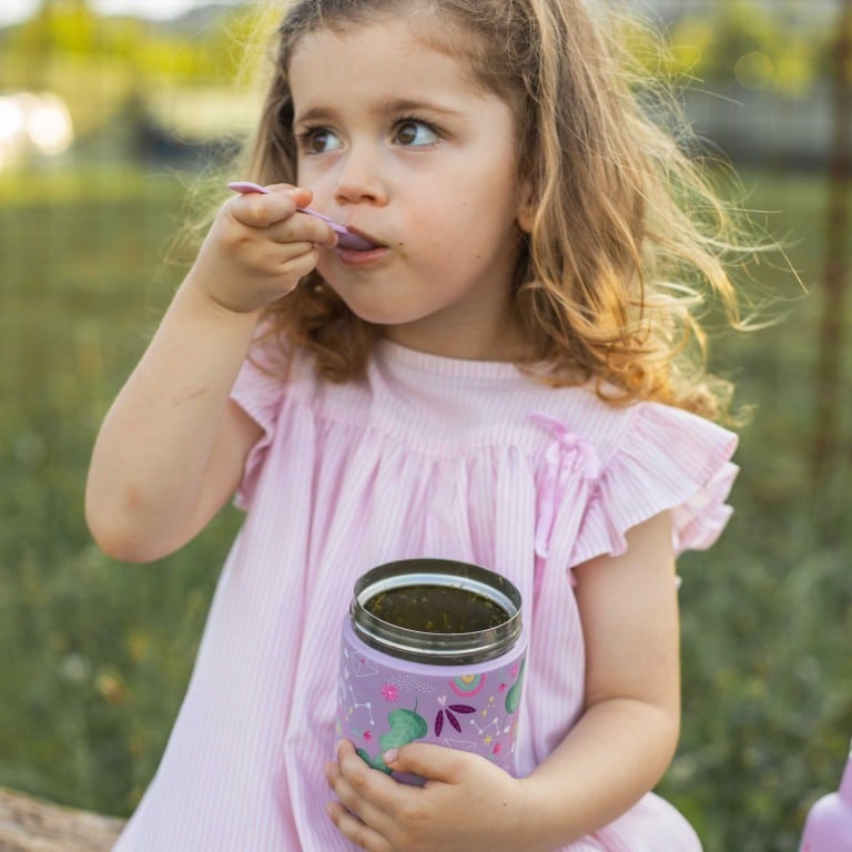 Termoska na jedlo s motívom očarujúceho jednorožca Spaklyho je ideálna na udržiavanie detských jedál teplých doma, v škôlke alebo na cestách. Vyrobená z kvalitnej nehrdzavejúcej ocele s dvojitou stenou, udrží jedlo teplé (alebo studené) celé hodiny a zabezpečí, že bude vždy chutné a pripravené na podávanie. Vzduchotesné viečko a kompaktný dizajn umožňujú bezpečné prenášanie v batohu či taške. Táto izolovaná termoska je ideálna na prvé príkrmy, polievky alebo pyré, ľahko sa čistí a je úplne bez BPA a PVC.