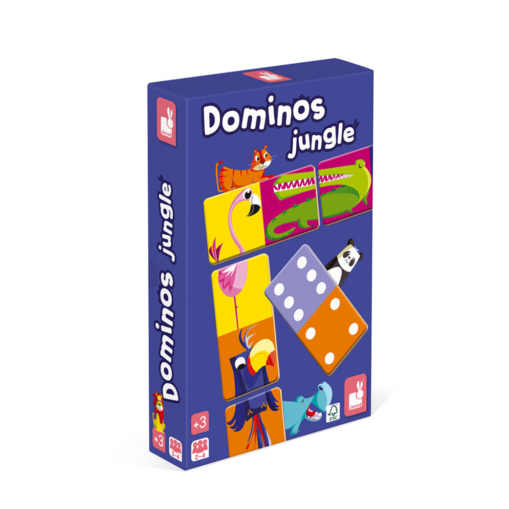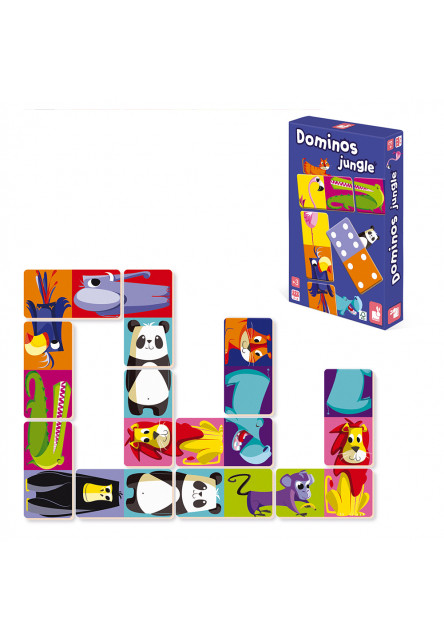 Domino Jungle - sociální hra se zvířaty - Jaká zvířata z džungle znáte? Víte, jaké zvíře je na obrázku? Kartonový dvojitý domino s motivy džungle je skvělým dárkem pro vaše děti. Domino karty jsou očíslovány na jedné straně a zvíře je obrázek zvířat. Cílem hry je dát domino karty dohromady, aby se dotkly stejného vzoru - číslo nebo obrázek. vyhraje hráče, který je první, kdo umístí všechny své domino karty. Domino vyvíjí pozorování, paměťové a motorové dovednosti. hra je vhodná pro 2 nebo více hráčů pro děti ve věku 3 až 7 let obsahuje 28 kusů.