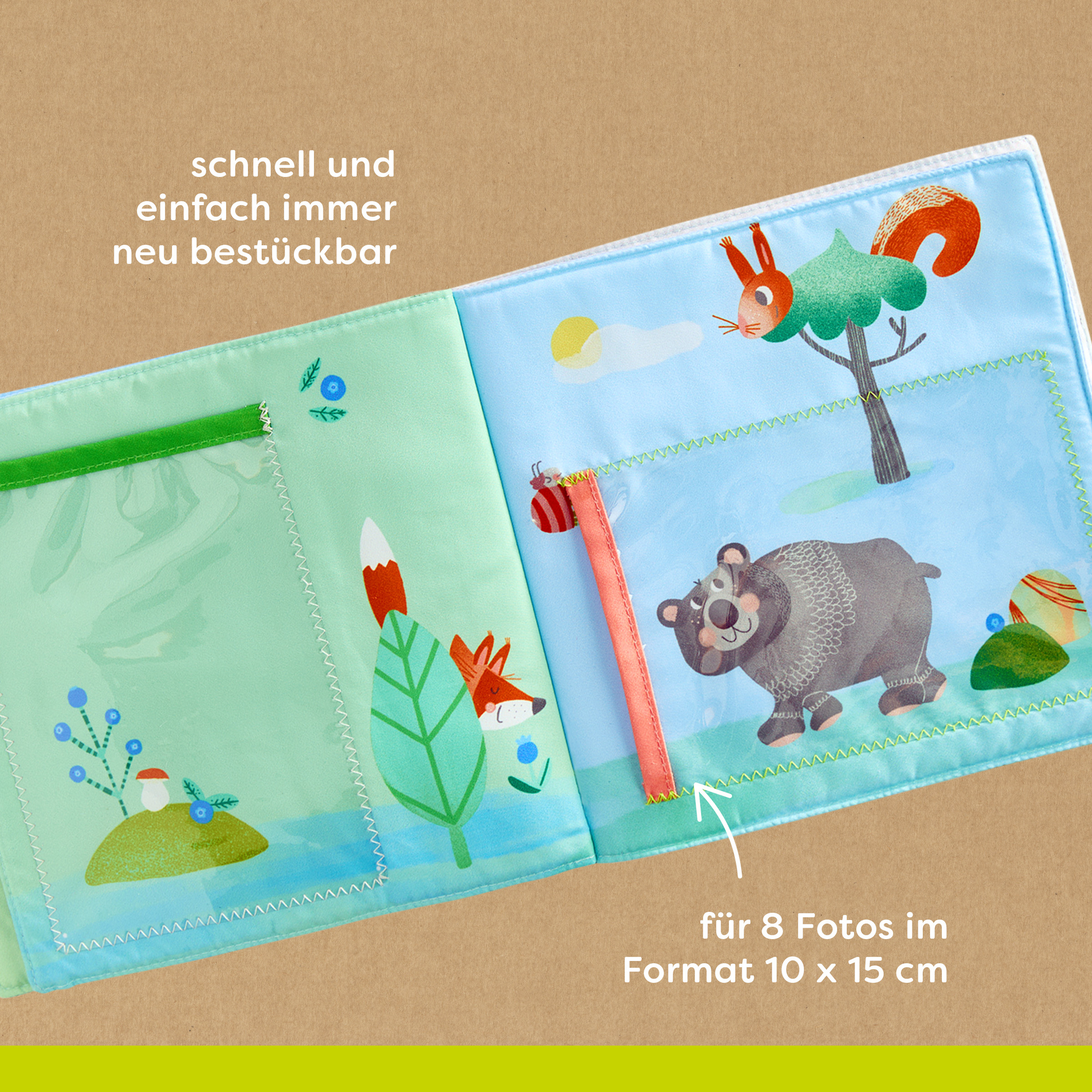 Fotografie vo vreckách sa dajú jednoducho znova a znova meniť, čím je fotoalbum stále pútavý a ponúka nekonečné možnosti na rozhovory a rozprávanie príbehov s malými prieskumníkmi.