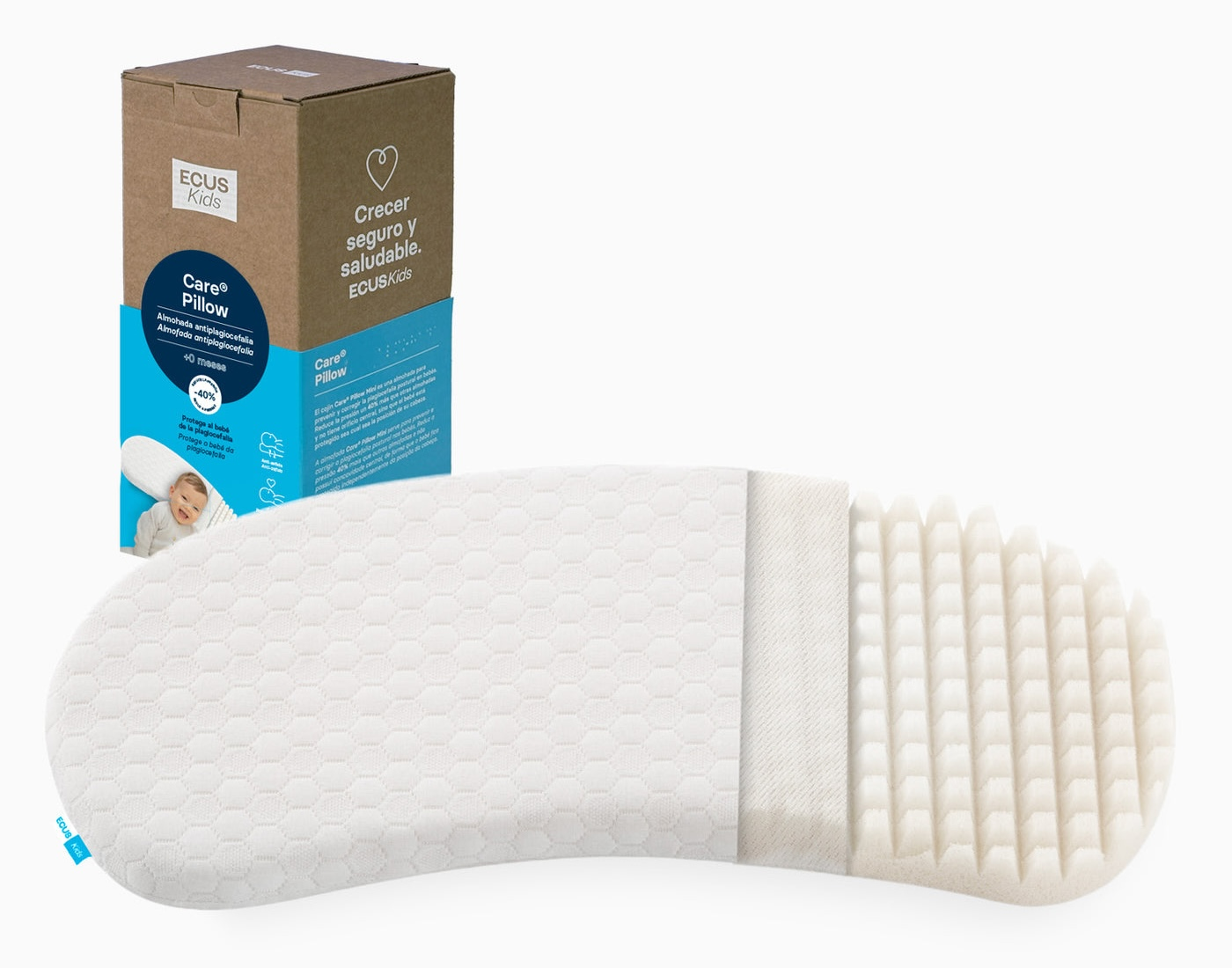 Dětský mini polštář Ecus Kids Care pomáhá předcházet zploštění hlavičky (plagiocefalii) u kojenců. Snižuje tlak o 40 % více než jiné polštáře a nemá středový otvor, takže chrání dítě bez ohledu na polohu jeho hlavy.