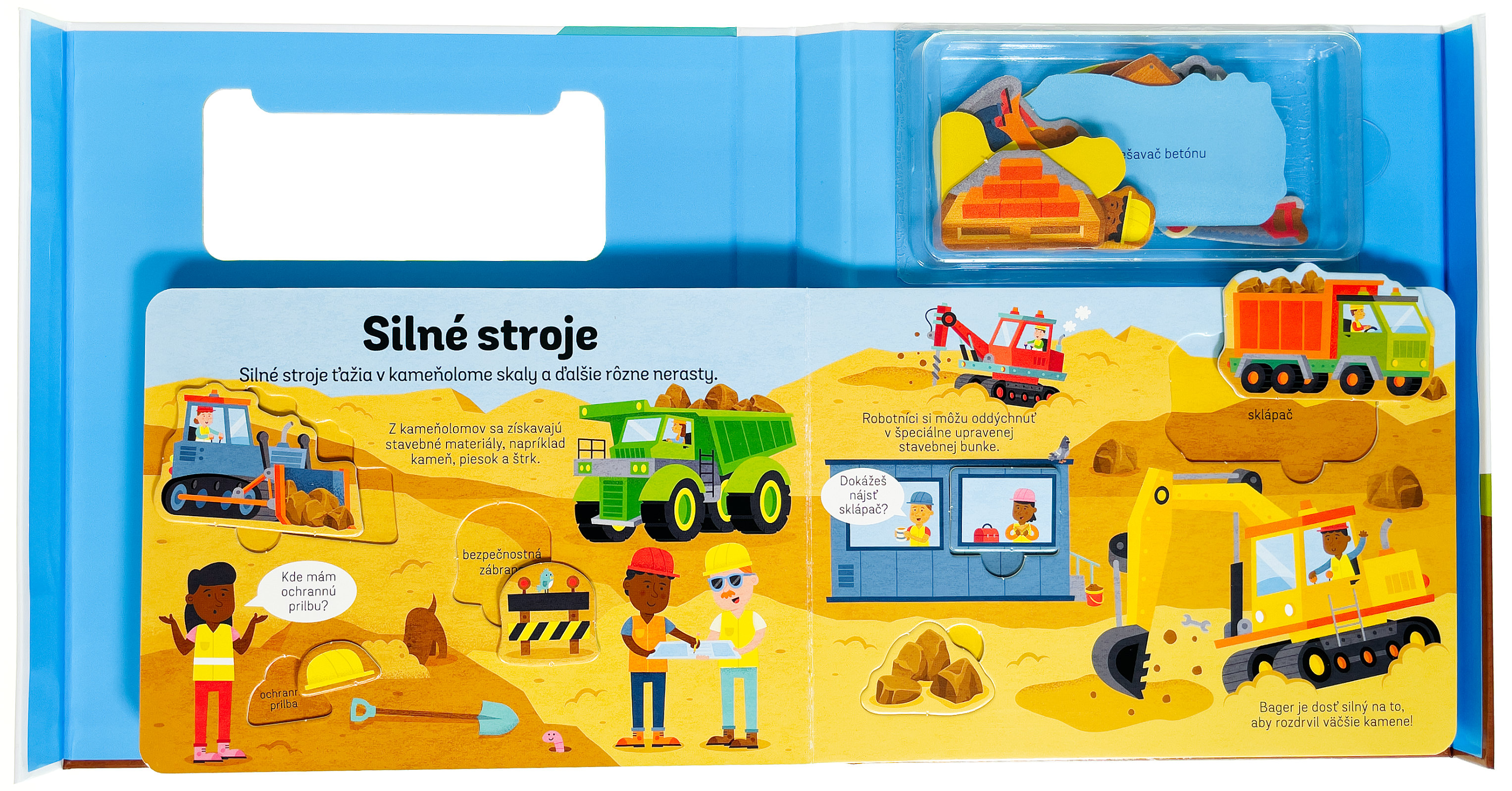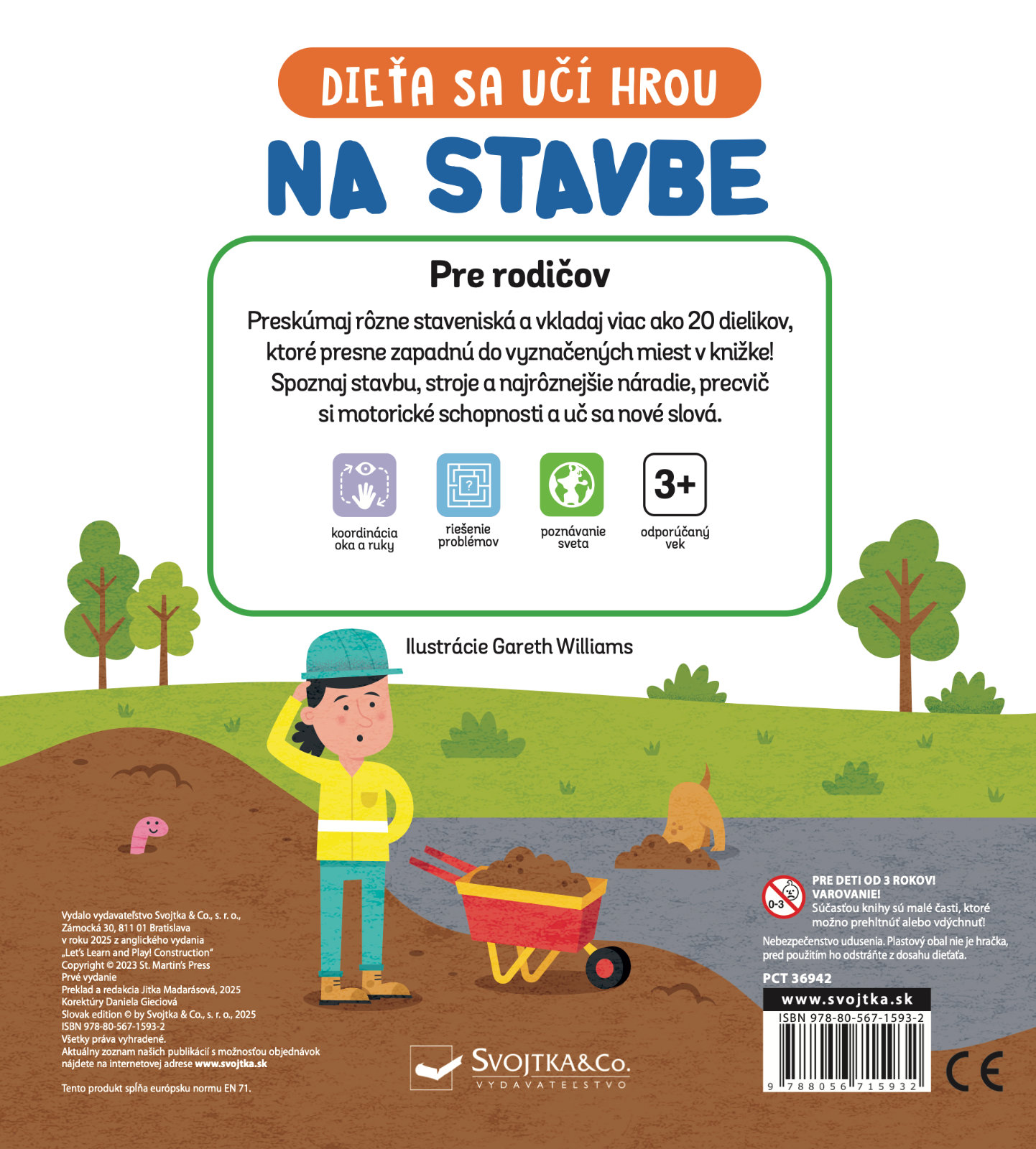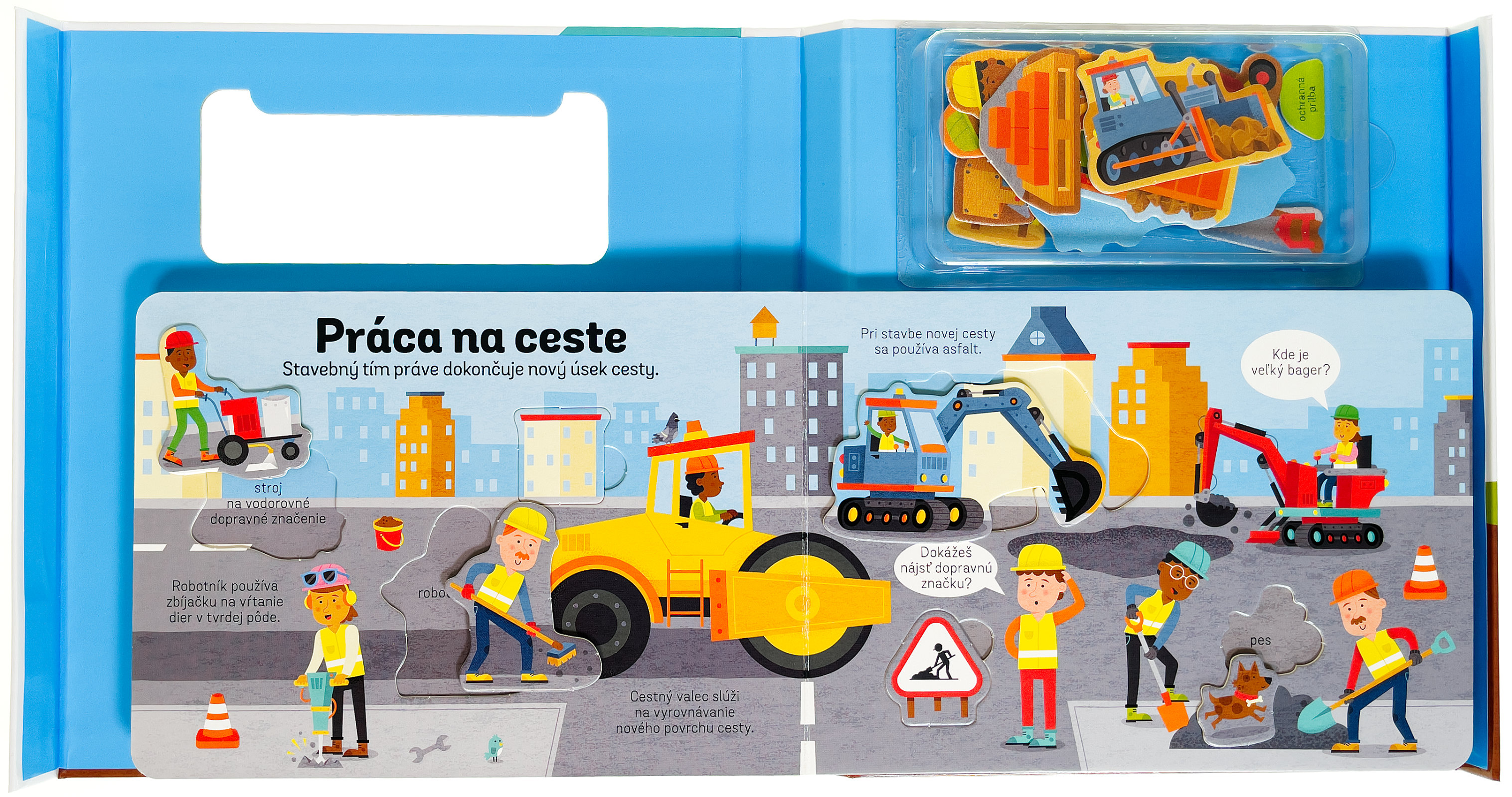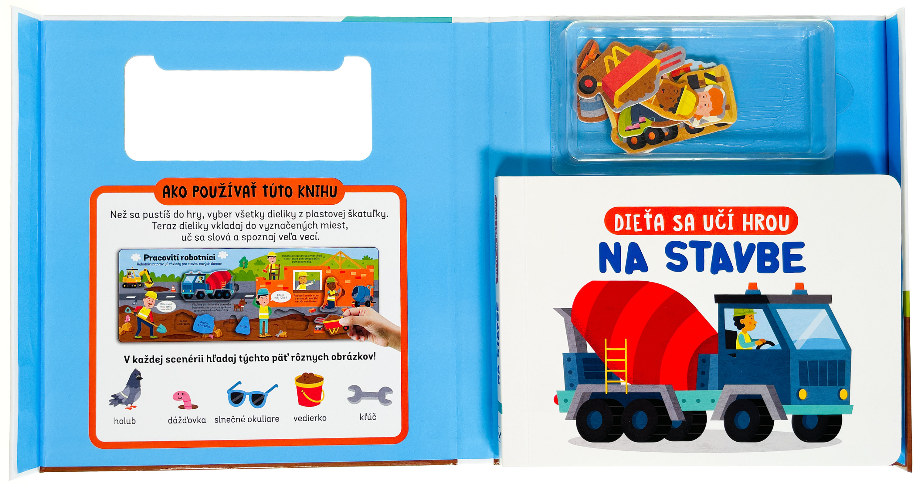 Vyberte si z plastovej škatuľky, ktorá je súčasťou knihy, všetky dieliky a postupne ich vkladajte na správne miesta. Dielik aj vyznačené miesto majú popis, takže sa deti môžu zoznámiť aj s prvými slovami s tematikou stavby. Táto veselo ilustrovaná knižka deti zoznámi so staveniskom, strojmi a rôznym náradím. Na každej dvojstrane môžu deti zároveň hľadať vždy päť obrázkov a precvičovať si tak pozornosť a sústredenie. S knižkou aj dielikmi sa deti rozhodne nudiť nebudú a strávia s nimi celé hodiny staviteľskej zábavy, kedy budú spoznávať okolitý svet, precvičovať jemnú motoriku a pozornosť.Počet strán: 10