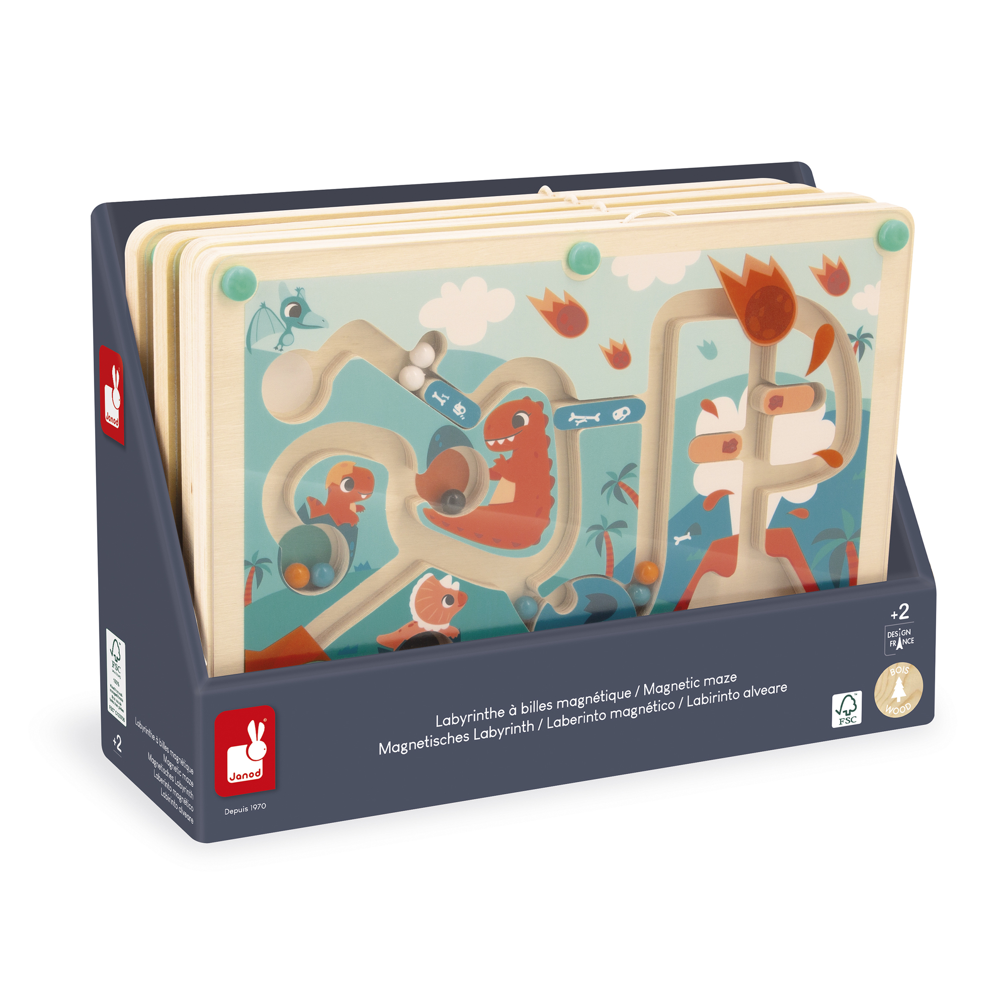 Vitajte v Jurskom svete! Svet obývaný dinosaurami. Prejdite cez bludisko zo sopky a pomocou magnetického stylusu prineste 12 farebných guľôčok do príslušnej zóny. Dávajte si pozor na prekážky! Budete tiež musieť použiť turniket, aby ste sa vyhli uviaznutiu a pridali sa k malým dinosaurom! Rozvíja jemnú obratnosť. Hračka vyrobená z dreva FSC pre deti od 2 rokov.