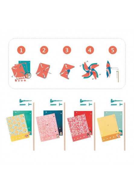 DIY sada Vrtuľky – Pastelové farby obsahuje všetko, čo potrebuješ na zhotovenie 4 pestrofarebných vrtuliek. Hárky papiera, z ktorého si ružice poskladáš, sú obojstranne potlačené – pastelové farby a geometricky stvárnené kvetové vzory sú perfektne zladené. Listy ružice sú na hárkoch predvyrezané, takže netreba nič strihať. Papier je laminovaný, vďaka čomu je odolný. Listy preložíš a zopneš z oboch strán príchytkou, ktorú nastokneš na drevenú paličku. A je to, môže fúkať vietor!