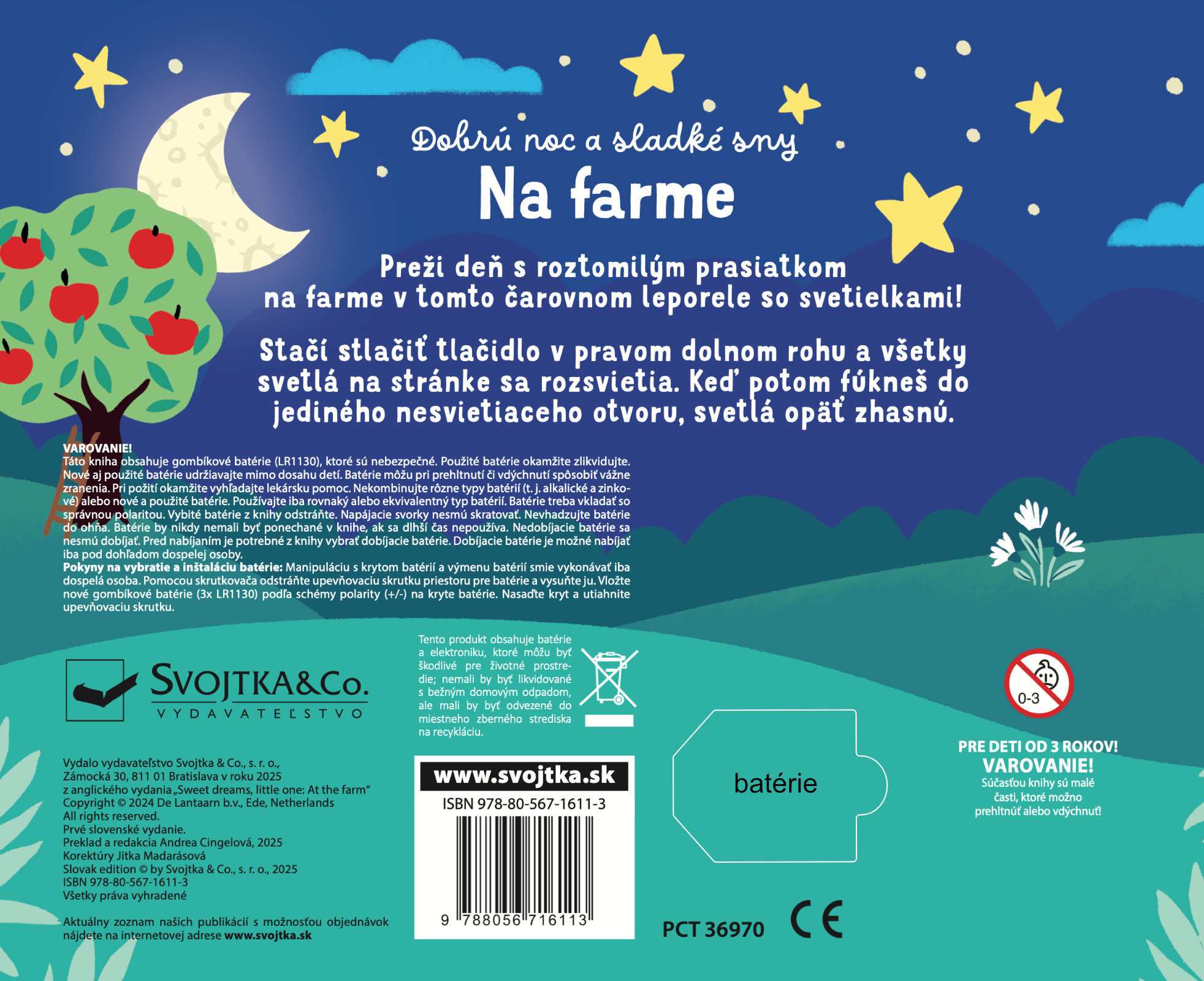 Prežite deň s jedným roztomilým teliatkom na farme v tomto leporele so svetielkami. Teliatko sa rado hrá s ostatnými zvieratami, ale po celom dni je unavené. Ulož ho do postieľky a fúknutím zhasni svetielka. Ako kniha funguje? Najprv stlač tlačidlo v pravom dolnom rohu a všetky svetlá na stránke sa rozsvietia. Potom fúkni do jediného otvoru, ktorý nesvieti, a všetky svetlá zhasnú. Ideálna knižka pred spaním.Počet strán: 10