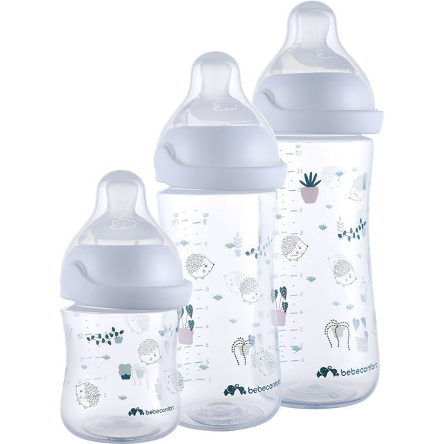 Kojenecká lahvička Bebeconfort Emotion Physio s unikátní silikonovou savičkou fyziologického tvaru je zárukou, že dítě téměř nepociťuje rozdíl mezi kojením a krmením z lahvičky. Lahvička je antikoliková, opatřená dvojitým ventilačním systémem na okraji savičky, který citlivě zabezpečí únik vzduchu z láhve, tím umožní plynulé sání tekutiny a zároveň snižuje riziko břišní koliky.