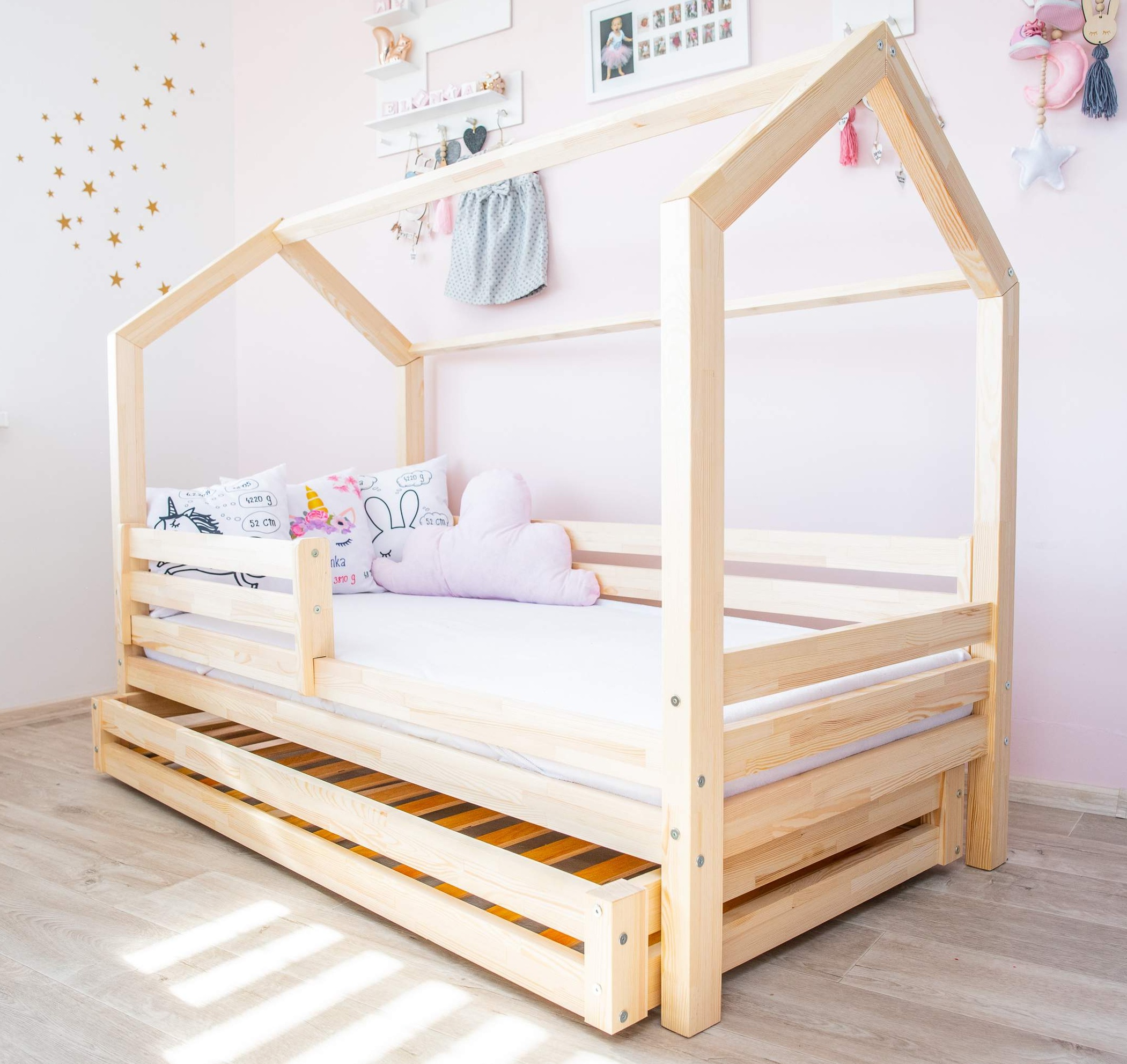 Udržateľný e-shop nie je iba pečiatka pri logu. Ďakujeme, že sa s nami staráte o životné prostredie. Ak premýšľate nad tým, akú posteľ kúpiť vášmu dieťaťu, už viac rozmýšľať nemusíte. Práve ste ju našli. Detská domčeková posteľ je skvelým riešením, ak je vaše dieťa už pripravené spať samé. Útulný priestor je základom, a preto je posteľ od Elis Design v tvare domčeka. Naša domčeková posteľ je doplnená o jednu skvelú vychytávku, ktorou je šuplík. Dno šuplíka nie je plné, tvorí ho rošt. Ten môžete využiť ako úložný priestor väčších predmetov, ale využiť sa dá aj ako ďalšia posteľ. Takže ak k vám príde na "nocovačku" spolužiak či spolužiačka vášho dieťaťa, nie je nič ľahšie, ako vytiahnuť šuplík. Ak sa vaše dieťa necíti samé celkom komfortne, môžete mu zaobstarať spoločníkov v podobe zvieracích nálepiek. Ak má vaše dieťa rado pevnosti, okrem domčekovej postele mu môžete zaobstarať aj domčekový písací stôl či detský regál. Nezabúdame však ani na bezpečnosť Vášho dieťaťa. Domčeková posteľ je spracovaná z pevného borovicového dreva, je zabrúsená dohladka, takže nehrozia žiadne odery či úrazy. Masívna konštrukcia je prispôsobená aj tým najnáročnejším podmienkam. Nakonfigurujte si detskú domčekovú posteľ podľa seba: Postele vyrábame pre Vás na mieru, preto si môžete posteľ vybrať takú, aká vám vyhovuje. Na výber máte množstvo rozmerov, tie najobľúbenejšie pre vás máme skladom. Ak si vyberiete posteľ, ktorá skladom nie je, radi vám ju vyrobíme. Jej dodacia doba potom je 4-8 týždňov. Detskú domčekovú posteľ môžete mať: bez nožičiek - výška rámu od podlahy je 1 cm; dĺžka ku zlomu postele je 99 cm. s nožičkami - vyššie navŕtanie, vďaka čomu vznikne pod posteľou 20 cm priestor, kam si môžete vložiť šuplík. Celková výška postele je rovnaká v oboch prípadoch, bez nožičiek aj s nožičkami. Dĺžka nohy ku zlomu je 99 cm. jednoduchú bez zábran so zábranami - zábrany si môžete vybrať predné, zadné alebo obe zároveň. Zábrany sú 20 cm vysoké od hrany postele. Zadná zábrana je po celej dĺžke postele, predná do polovice postele. Zábrany sa jednoducho nasadzujú na hornú dosku. so šuplíkom - ktorý môžete využiť ako úložný priestor alebo výsuvné lôžko. Dno šuplíka nie je plné, tvorí ho rošt. Šuplík je vysoký 16 cm a dodávame k nemu aj lamelový rošt ZADARMO. Pre jednoduchšiu manipuláciu má šuplík gumové kolieska. Šuplík objednávajte v rovnakých rozmeroch ako posteľ a matrac do šuplíka objednávajte o 10 cm kratší (matrac nie je súčasťou). Výška matracu do šuplíka je max. 13 cm, ale odporúčame 11-12 cm. U domčekové postele s rozmerom lôžka 140 x 200 cm sú rozmery šuplíka 60 x 200 cm. so zábranami a šuplíkom - posteľ dostane kompletne plné vybavenie, so všetkým, čo ponúkame :-) ak si objednáte posteľ bez nožičiek, je možné neskôr ich dokúpiť za 51,99 EUR. PRÉMIOVÝ SPÁNOK JEDINE S DETSKOU POSTEĽOU DOMINANT PREMIUM: pevnejšia konštrukcia domčeka, masívna trámová konštrukcia - lepené hranoly 6,5 x 4,5 cm bezpečné zábrany majú dve dosky, preto je vhodná aj pre menšie deti ZDARMA pružný lamelový rošt, zabudnite na obyčajné dosky kvalitne spracované drevo s certifikátom FSC - neprispievate k devastácii lesov a pralesov ani nepodporujete nezákonnú ťažbu dreva borovicové drevo bez chemickej úpravy a s pôvodom v EÚ kvalitné hladké opracovanie, bez triesok lepené trámy, vďaka ktorým sa hranoly nekrútia, ale pevne držia bezpečná doprava k Vám domov Technické parametre a ďalšie užitočné informácie: Rozmery postele: rôzne veľkosti - 70x140 cm a 70x160 cm (výška 127 cm), 80x160 cm, 80x180 cm, 80x190 cm, 80x200 cm (výška 131 cm), 90x180 cm, 90x190 cm, 90x200 cm (výška 134 cm), 100x180 cm, 100x190 cm, 100x200 cm (výška 138 cm) Rozmery: posteľ je o 7 cm širšia a o 7 cm dlhší ako vybraný rozmer lôžka (presné rozmery v galérii obrázkov). Nosnosť: normovaná nosnosť je 100 kg, ale posteľ vydrží aj viac. Výška matracu do postele: maximálne 12 cm (nie je súčasťou balenia), výška matraca do šuplíka je maximálne 12 cm, avšak odporúčame 11-12 cm Materiál: kvalitné prírodné borovicové drevo Dodacia lehota je približne 4-8 týždňov od pripísania platby na účet. Upozornenie: V prípade objednania domčekovej postele širšej ako 100 cm (120 cm alebo 140 cm) je rozmer šuplíka iba 60 x 200 cm (z dôvodu lepšej stability postele je posteľ vybavená stredovou priečkou, ktorá neumožňuje pod posteľ zasunúť hlbší šuplík). Nábytok dodávame v balíku alebo na palete, negarantujeme dodanie (vynesenie) do domu či bytu, toto nie je štandardná služba dopravcu. V galérii obrázkov chýbajú obrázky variantov len s prednou alebo len so zadnou zábranou. Prosíme, pred montážou produktu si skontrolujte obsah balenia. Ak budú na zostavenie produktu použité poškodené komponenty, nebudeme môcť uznať Vašu následnú reklamáciu. K posteliam dĺžky 140 až 160 cm dodávame 14 ks lamiel, k posteliam dĺžky 180 až 200 cm dodávame 16 ks lamiel. Prvú lamelu namontuje cca 3 cm od okraja tak, aby ostatné lamely na seba nadväzovali v rovnakých rozostupoch. Udržiavajte rovnaké vzdialenosti medzi lamelami. Návod na zostavenie: Bezpečnostní pokyny Premium Domečková postel se šuplíkem Premium (bez nožiček) Domečková postel se šuplíkem Premium Dvojitý rošt_SK šuplík - návod Sledujte naše video a spoznajte kvalitu a detaily montáže našej prémiovej domčekovej postele: