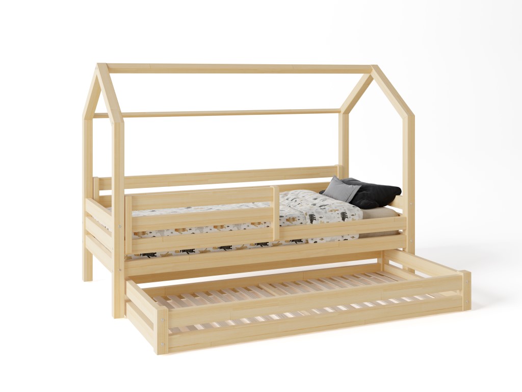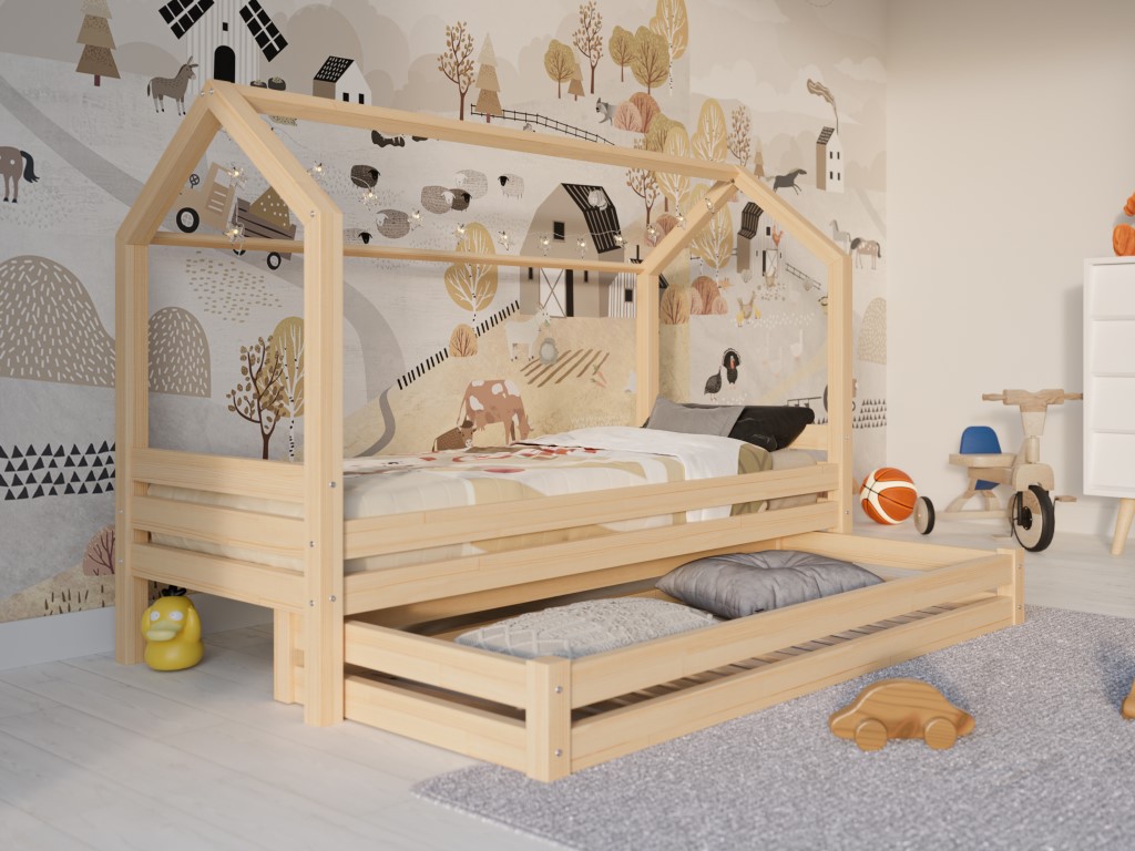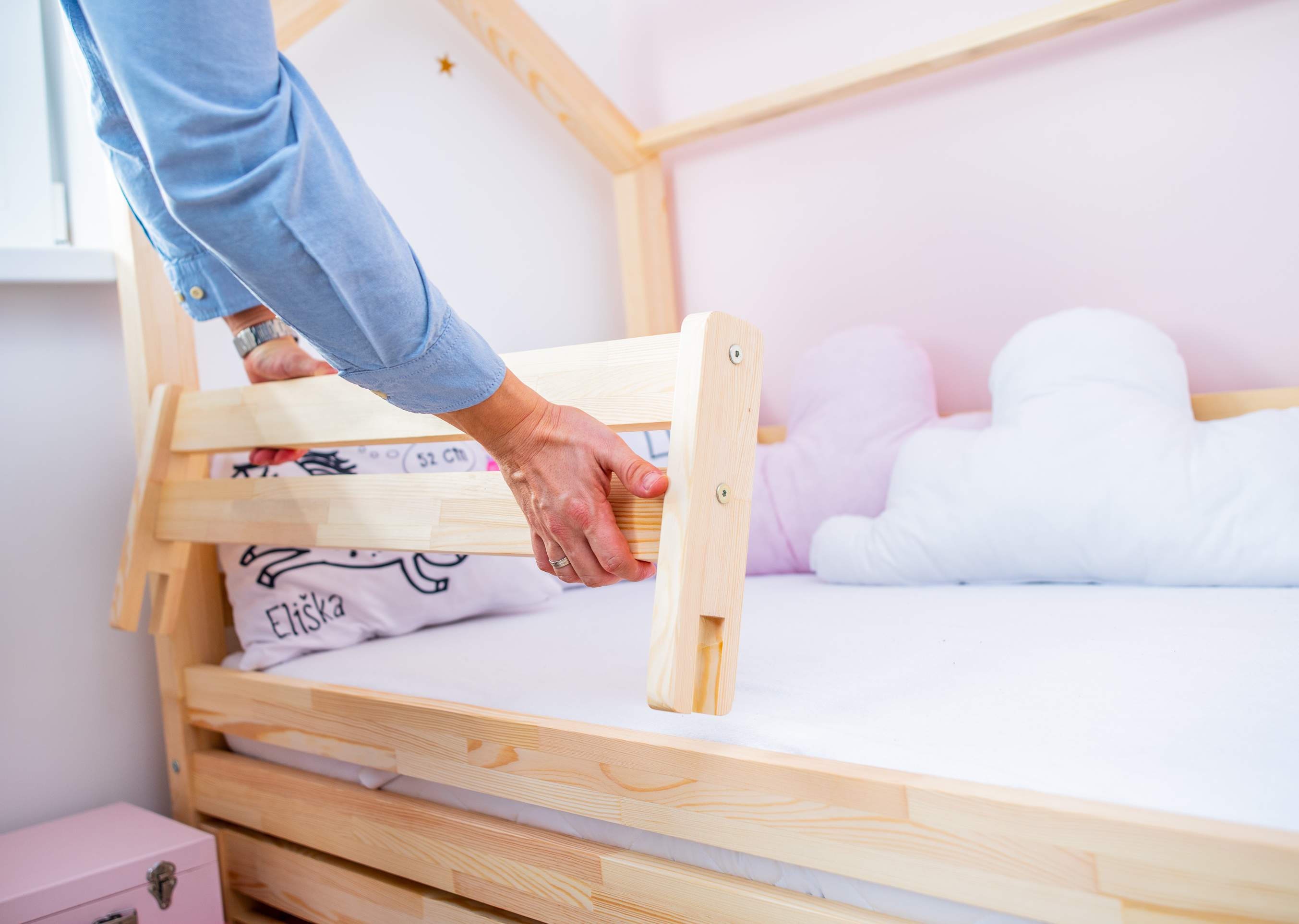 Udržateľný e-shop nie je iba pečiatka pri logu. Ďakujeme, že sa s nami staráte o životné prostredie. Ak premýšľate nad tým, akú posteľ kúpiť vášmu dieťaťu, už viac rozmýšľať nemusíte. Práve ste ju našli.  Detská domčeková posteľ je skvelým riešením, ak je vaše dieťa už pripravené spať samé. Útulný priestor je základom, a preto je posteľ od Elis Design v tvare domčeka. Naša domčeková posteľ je doplnená o jednu skvelú vychytávku, ktorou je šuplík. Dno šuplíka nie je plné, tvorí ho rošt. Ten môžete využiť ako úložný priestor väčších predmetov, ale využiť sa dá aj ako ďalšia posteľ. Takže ak k vám príde na "nocovačku" spolužiak či spolužiačka vášho dieťaťa, nie je nič ľahšie, ako vytiahnuť šuplík. Ak sa vaše dieťa necíti samé celkom komfortne, môžete mu zaobstarať spoločníkov v podobe zvieracích nálepiek. Ak má vaše dieťa rado pevnosti, okrem domčekovej postele mu môžete zaobstarať aj domčekový písací stôl či detský regál. Nezabúdame však ani na bezpečnosť Vášho dieťaťa. Domčeková posteľ je spracovaná z pevného borovicového dreva, je zabrúsená dohladka, takže nehrozia žiadne odery či úrazy. Masívna konštrukcia je prispôsobená aj tým najnáročnejším podmienkam. Nakonfigurujte si detskú domčekovú posteľ podľa seba: Postele vyrábame pre Vás na mieru, preto si môžete posteľ vybrať takú, aká vám vyhovuje. Na výber máte množstvo rozmerov, tie najobľúbenejšie pre vás máme skladom. Ak si vyberiete posteľ, ktorá skladom nie je, radi vám ju vyrobíme. Jej dodacia doba potom je 4-8 týždňov. Detskú domčekovú posteľ môžete mať: bez nožičiek - výška rámu od podlahy je 1 cm; dĺžka ku zlomu postele je 99 cm. s nožičkami - vyššie navŕtanie, vďaka čomu vznikne pod posteľou 20 cm priestor, kam si môžete vložiť šuplík. Celková výška postele je rovnaká v oboch prípadoch, bez nožičiek aj s nožičkami. Dĺžka nohy ku zlomu je 99 cm. jednoduchú bez zábran so zábranami - zábrany si môžete vybrať predné, zadné alebo obe zároveň. Zábrany sú 20 cm vysoké od hrany postele. Zadná zábrana je po celej dĺžke postele, predná do polovice postele. Zábrany sa jednoducho nasadzujú na hornú dosku. so šuplíkom - ktorý môžete využiť ako úložný priestor alebo výsuvné lôžko. Dno šuplíka nie je plné, tvorí ho rošt. Šuplík je vysoký 16 cm a dodávame k nemu aj lamelový rošt ZADARMO. Pre jednoduchšiu manipuláciu má šuplík gumové kolieska. Šuplík objednávajte v rovnakých rozmeroch ako posteľ a matrac do šuplíka objednávajte o 10 cm kratší (matrac nie je súčasťou). Výška matracu do šuplíka je max. 13 cm, ale odporúčame 11-12 cm. U domčekové postele s rozmerom lôžka 140 x 200 cm sú rozmery šuplíka 60 x 200 cm. so zábranami a šuplíkom - posteľ dostane kompletne plné vybavenie, so všetkým, čo ponúkame :-) ak si objednáte posteľ bez nožičiek, je možné neskôr ich dokúpiť za 51,99 EUR. PRÉMIOVÝ SPÁNOK JEDINE S DETSKOU POSTEĽOU DOMINANT PREMIUM: pevnejšia konštrukcia domčeka, masívna trámová konštrukcia - lepené hranoly 6,5 x 4,5 cm bezpečné zábrany majú dve dosky, preto je vhodná aj pre menšie deti ZDARMA pružný lamelový rošt, zabudnite na obyčajné dosky kvalitne spracované drevo s certifikátom FSC - neprispievate k devastácii lesov a pralesov ani nepodporujete nezákonnú ťažbu dreva borovicové drevo bez chemickej úpravy a s pôvodom v EÚ kvalitné hladké opracovanie, bez triesok lepené trámy, vďaka ktorým sa hranoly nekrútia, ale pevne držia bezpečná doprava k Vám domov Technické parametre a ďalšie užitočné informácie: Rozmery postele: rôzne veľkosti - 70x140 cm a 70x160 cm (výška 127 cm), 80x160 cm, 80x180 cm, 80x190 cm, 80x200 cm (výška 131 cm), 90x180 cm, 90x190 cm, 90x200 cm (výška 134 cm), 100x180 cm, 100x190 cm, 100x200 cm (výška 138 cm) Rozmery: posteľ je o 7 cm širšia a o 7 cm dlhší ako vybraný rozmer lôžka (presné rozmery v galérii obrázkov). Nosnosť: normovaná nosnosť je 100 kg, ale posteľ vydrží aj viac. Výška matracu do postele: maximálne 12 cm (nie je súčasťou balenia), výška matraca do šuplíka je maximálne 12 cm, avšak odporúčame 11-12 cm Materiál: kvalitné prírodné borovicové drevo Dodacia lehota je približne 4-8 týždňov od pripísania platby na účet. Upozornenie: V prípade objednania domčekovej postele širšej ako 100 cm (120 cm alebo 140 cm) je rozmer šuplíka iba 60 x 200 cm (z dôvodu lepšej stability postele je posteľ vybavená stredovou priečkou, ktorá neumožňuje pod posteľ zasunúť hlbší šuplík). Nábytok dodávame v balíku alebo na palete, negarantujeme dodanie (vynesenie) do domu či bytu, toto nie je štandardná služba dopravcu. V galérii obrázkov chýbajú obrázky variantov len s prednou alebo len so zadnou zábranou. Prosíme, pred montážou produktu si skontrolujte obsah balenia. Ak budú na zostavenie produktu použité poškodené komponenty, nebudeme môcť uznať Vašu následnú reklamáciu. K posteliam dĺžky 140 až 160 cm dodávame 14 ks lamiel, k posteliam dĺžky 180 až 200 cm dodávame 16 ks lamiel. Prvú lamelu namontuje cca 3 cm od okraja tak, aby ostatné lamely na seba nadväzovali v rovnakých rozostupoch. Udržiavajte rovnaké vzdialenosti medzi lamelami. Návod na zostavenie: Bezpečnostní pokyny Premium Domečková postel se šuplíkem Premium (bez nožiček) Domečková postel se šuplíkem Premium Dvojitý rošt_SK šuplík - návod Sledujte naše video a spoznajte kvalitu a detaily montáže našej prémiovej domčekovej postele: