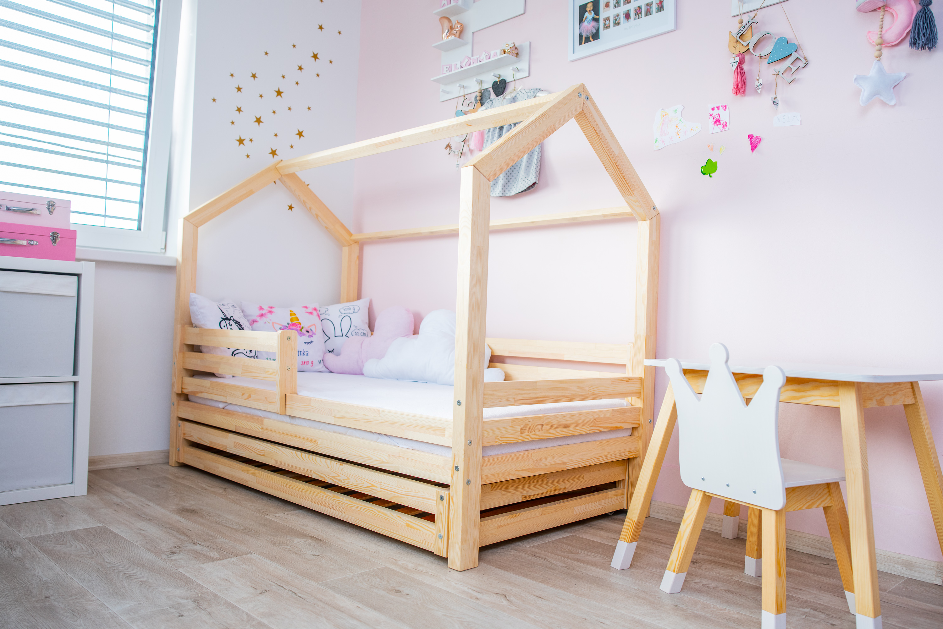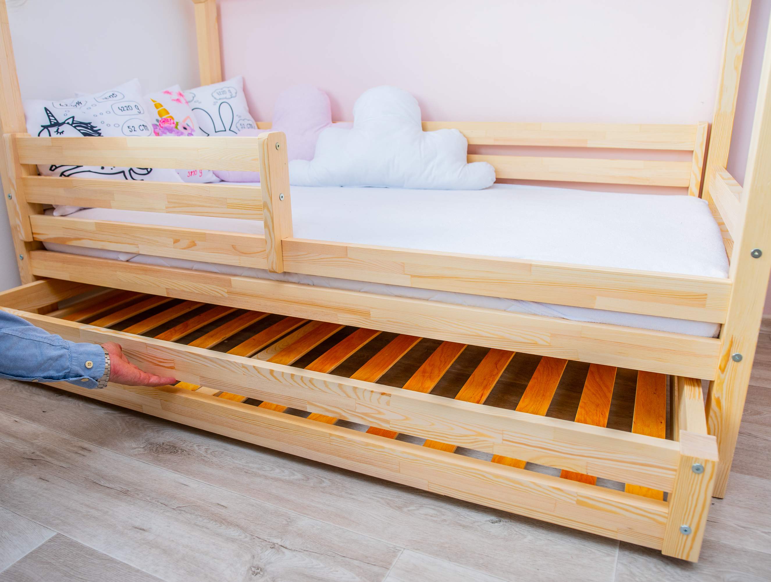 Udržateľný e-shop nie je iba pečiatka pri logu. Ďakujeme, že sa s nami staráte o životné prostredie. Ak premýšľate nad tým, akú posteľ kúpiť vášmu dieťaťu, už viac rozmýšľať nemusíte. Práve ste ju našli.  Detská domčeková posteľ je skvelým riešením, ak je vaše dieťa už pripravené spať samé. Útulný priestor je základom, a preto je posteľ od Elis Design v tvare domčeka. Naša domčeková posteľ je doplnená o jednu skvelú vychytávku, ktorou je šuplík. Dno šuplíka nie je plné, tvorí ho rošt. Ten môžete využiť ako úložný priestor väčších predmetov, ale využiť sa dá aj ako ďalšia posteľ. Takže ak k vám príde na "nocovačku" spolužiak či spolužiačka vášho dieťaťa, nie je nič ľahšie, ako vytiahnuť šuplík. Ak sa vaše dieťa necíti samé celkom komfortne, môžete mu zaobstarať spoločníkov v podobe zvieracích nálepiek. Ak má vaše dieťa rado pevnosti, okrem domčekovej postele mu môžete zaobstarať aj domčekový písací stôl či detský regál. Nezabúdame však ani na bezpečnosť Vášho dieťaťa. Domčeková posteľ je spracovaná z pevného borovicového dreva, je zabrúsená dohladka, takže nehrozia žiadne odery či úrazy. Masívna konštrukcia je prispôsobená aj tým najnáročnejším podmienkam. Nakonfigurujte si detskú domčekovú posteľ podľa seba: Postele vyrábame pre Vás na mieru, preto si môžete posteľ vybrať takú, aká vám vyhovuje. Na výber máte množstvo rozmerov, tie najobľúbenejšie pre vás máme skladom. Ak si vyberiete posteľ, ktorá skladom nie je, radi vám ju vyrobíme. Jej dodacia doba potom je 4-8 týždňov. Detskú domčekovú posteľ môžete mať: bez nožičiek - výška rámu od podlahy je 1 cm; dĺžka ku zlomu postele je 99 cm. s nožičkami - vyššie navŕtanie, vďaka čomu vznikne pod posteľou 20 cm priestor, kam si môžete vložiť šuplík. Celková výška postele je rovnaká v oboch prípadoch, bez nožičiek aj s nožičkami. Dĺžka nohy ku zlomu je 99 cm. jednoduchú bez zábran so zábranami - zábrany si môžete vybrať predné, zadné alebo obe zároveň. Zábrany sú 20 cm vysoké od hrany postele. Zadná zábrana je po celej dĺžke postele, predná do polovice postele. Zábrany sa jednoducho nasadzujú na hornú dosku. so šuplíkom - ktorý môžete využiť ako úložný priestor alebo výsuvné lôžko. Dno šuplíka nie je plné, tvorí ho rošt. Šuplík je vysoký 16 cm a dodávame k nemu aj lamelový rošt ZADARMO. Pre jednoduchšiu manipuláciu má šuplík gumové kolieska. Šuplík objednávajte v rovnakých rozmeroch ako posteľ a matrac do šuplíka objednávajte o 10 cm kratší (matrac nie je súčasťou). Výška matracu do šuplíka je max. 13 cm, ale odporúčame 11-12 cm. U domčekové postele s rozmerom lôžka 140 x 200 cm sú rozmery šuplíka 60 x 200 cm. so zábranami a šuplíkom - posteľ dostane kompletne plné vybavenie, so všetkým, čo ponúkame :-) ak si objednáte posteľ bez nožičiek, je možné neskôr ich dokúpiť za 51,99 EUR. PRÉMIOVÝ SPÁNOK JEDINE S DETSKOU POSTEĽOU DOMINANT PREMIUM: pevnejšia konštrukcia domčeka, masívna trámová konštrukcia - lepené hranoly 6,5 x 4,5 cm bezpečné zábrany majú dve dosky, preto je vhodná aj pre menšie deti ZDARMA pružný lamelový rošt, zabudnite na obyčajné dosky kvalitne spracované drevo s certifikátom FSC - neprispievate k devastácii lesov a pralesov ani nepodporujete nezákonnú ťažbu dreva borovicové drevo bez chemickej úpravy a s pôvodom v EÚ kvalitné hladké opracovanie, bez triesok lepené trámy, vďaka ktorým sa hranoly nekrútia, ale pevne držia bezpečná doprava k Vám domov Technické parametre a ďalšie užitočné informácie: Rozmery postele: rôzne veľkosti - 70x140 cm a 70x160 cm (výška 127 cm), 80x160 cm, 80x180 cm, 80x190 cm, 80x200 cm (výška 131 cm), 90x180 cm, 90x190 cm, 90x200 cm (výška 134 cm), 100x180 cm, 100x190 cm, 100x200 cm (výška 138 cm) Rozmery: posteľ je o 7 cm širšia a o 7 cm dlhší ako vybraný rozmer lôžka (presné rozmery v galérii obrázkov). Nosnosť: normovaná nosnosť je 100 kg, ale posteľ vydrží aj viac. Výška matracu do postele: maximálne 12 cm (nie je súčasťou balenia), výška matraca do šuplíka je maximálne 12 cm, avšak odporúčame 11-12 cm Materiál: kvalitné prírodné borovicové drevo Dodacia lehota je približne 4-8 týždňov od pripísania platby na účet. Upozornenie: V prípade objednania domčekovej postele širšej ako 100 cm (120 cm alebo 140 cm) je rozmer šuplíka iba 60 x 200 cm (z dôvodu lepšej stability postele je posteľ vybavená stredovou priečkou, ktorá neumožňuje pod posteľ zasunúť hlbší šuplík). Nábytok dodávame v balíku alebo na palete, negarantujeme dodanie (vynesenie) do domu či bytu, toto nie je štandardná služba dopravcu. V galérii obrázkov chýbajú obrázky variantov len s prednou alebo len so zadnou zábranou. Prosíme, pred montážou produktu si skontrolujte obsah balenia. Ak budú na zostavenie produktu použité poškodené komponenty, nebudeme môcť uznať Vašu následnú reklamáciu. K posteliam dĺžky 140 až 160 cm dodávame 14 ks lamiel, k posteliam dĺžky 180 až 200 cm dodávame 16 ks lamiel. Prvú lamelu namontuje cca 3 cm od okraja tak, aby ostatné lamely na seba nadväzovali v rovnakých rozostupoch. Udržiavajte rovnaké vzdialenosti medzi lamelami. Návod na zostavenie: Bezpečnostní pokyny Premium Domečková postel se šuplíkem Premium (bez nožiček) Domečková postel se šuplíkem Premium Dvojitý rošt_SK šuplík - návod Sledujte naše video a spoznajte kvalitu a detaily montáže našej prémiovej domčekovej postele: