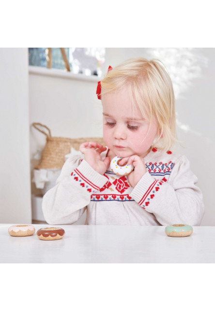 Set donutů z pevného dřeva, každý z nich je dekorován jinak. Baleno v krásném dárkovém boxu s oknem. Ideální doplněk pro Luxusní čajový vozík TV324. Hlavní vlastnosti: Hračka pro hraní na role podporuje děti v kreativitě a představivostiPomáhá s rozvojem klíčových dovedností včetně rozvoje sociálního a rozvoje řečiVyrobeno z odolného a udržitelného kaučukového dřeva – zaručuje dlouhotrvající zábavu a zároveň pečuje o naši planetuDekorováno netoxickými barvami, testováno dle nejpřísnějších standardů Honeybake kolekceHračky v této kolekci jsou vhodné k objevování, pomohou dětem s rozvojem představivosti, sociálních a verbálních dovedností a kognitivních funkcí. Tradiční design s moderními detaily děti jistě bude bavit. Honeybake je kolekce Le Toy Van, která vyhrála nejvíce ocenění a to za design, kvalitu, bezpečnost a také za vzdělávací a herní hodnotu.