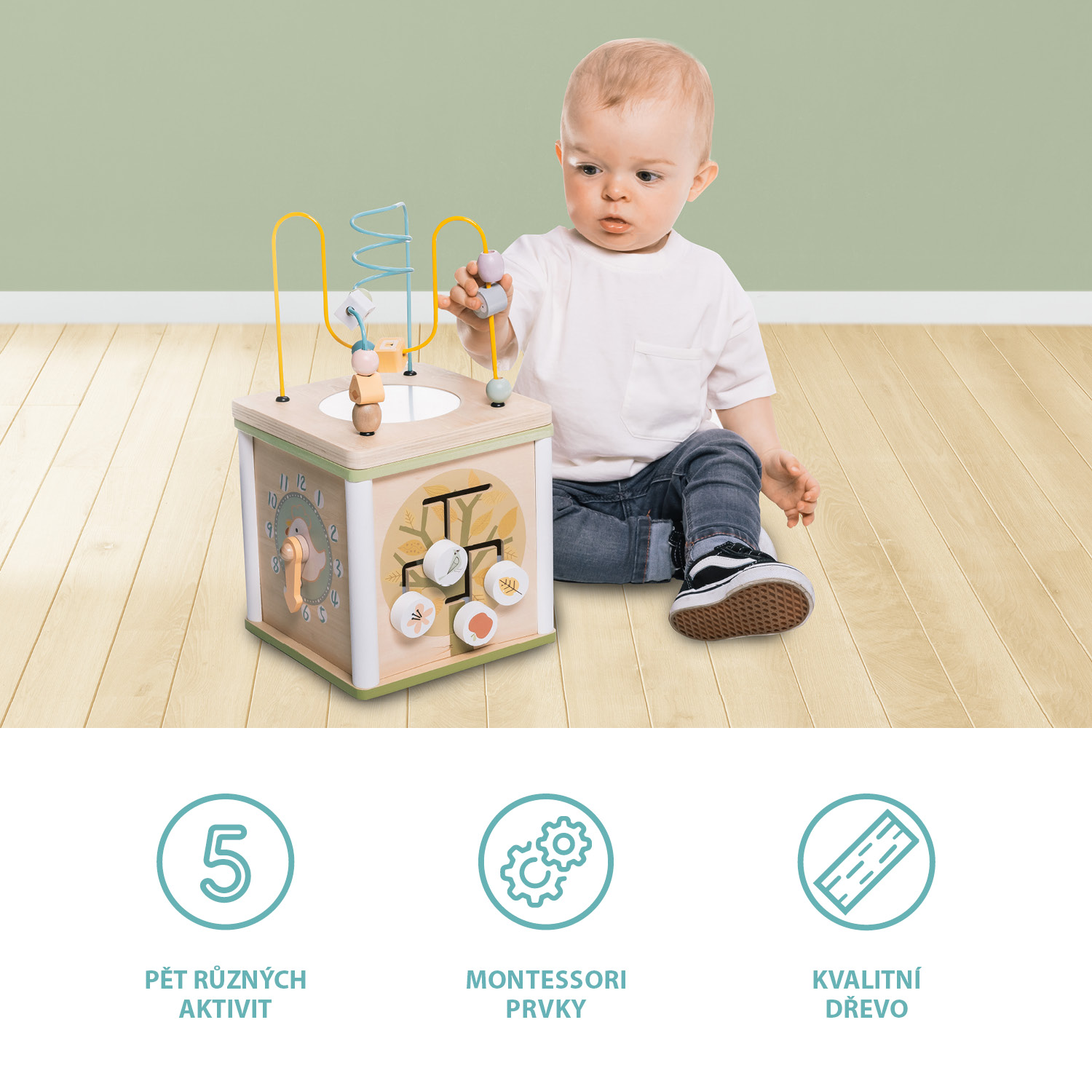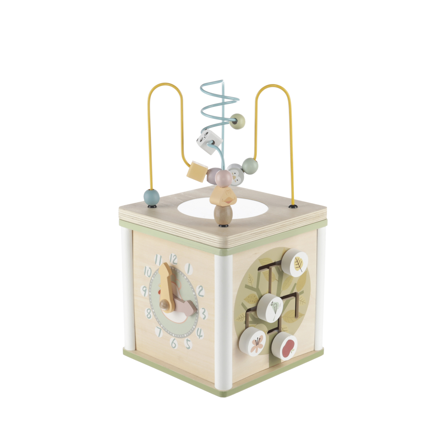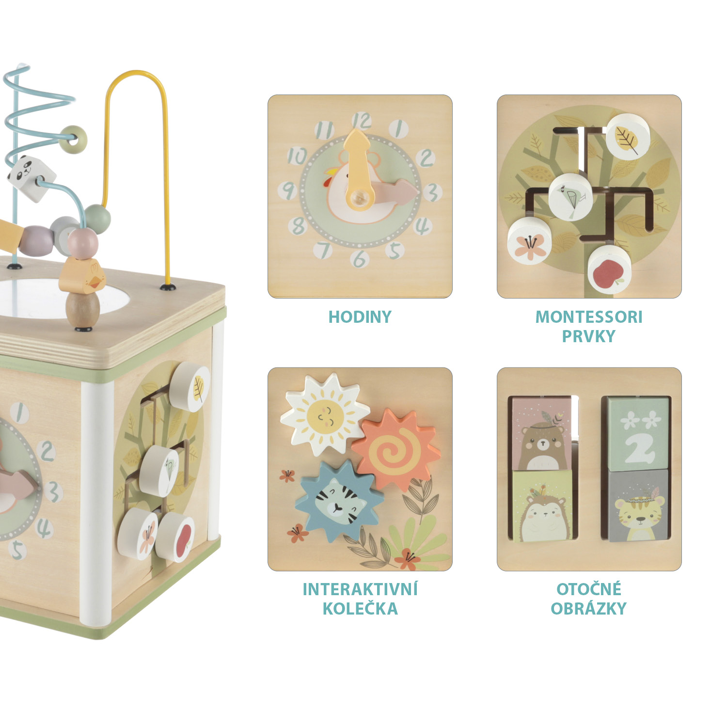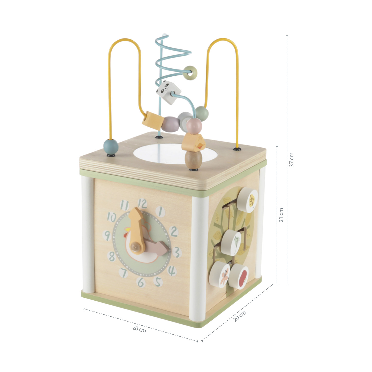Roztomilá kocka, ktorá ukrýva aktivitu v podobe skladačky. Na stranách kocky sú otočné drevené tvary s rôznymi motívmi. Hračka rozvíja koordináciu, priestorovú predstavivosť a zručnosti rúk. Posúvaním loptičiek a tvarov sa deti môžu naučiť aj prvé počítanie a rozpoznávanie farieb. Aktivity sú vyrobené z kvalitného dreva a farieb na vodnej báze.• Kocka so skladačkou vo vnútri