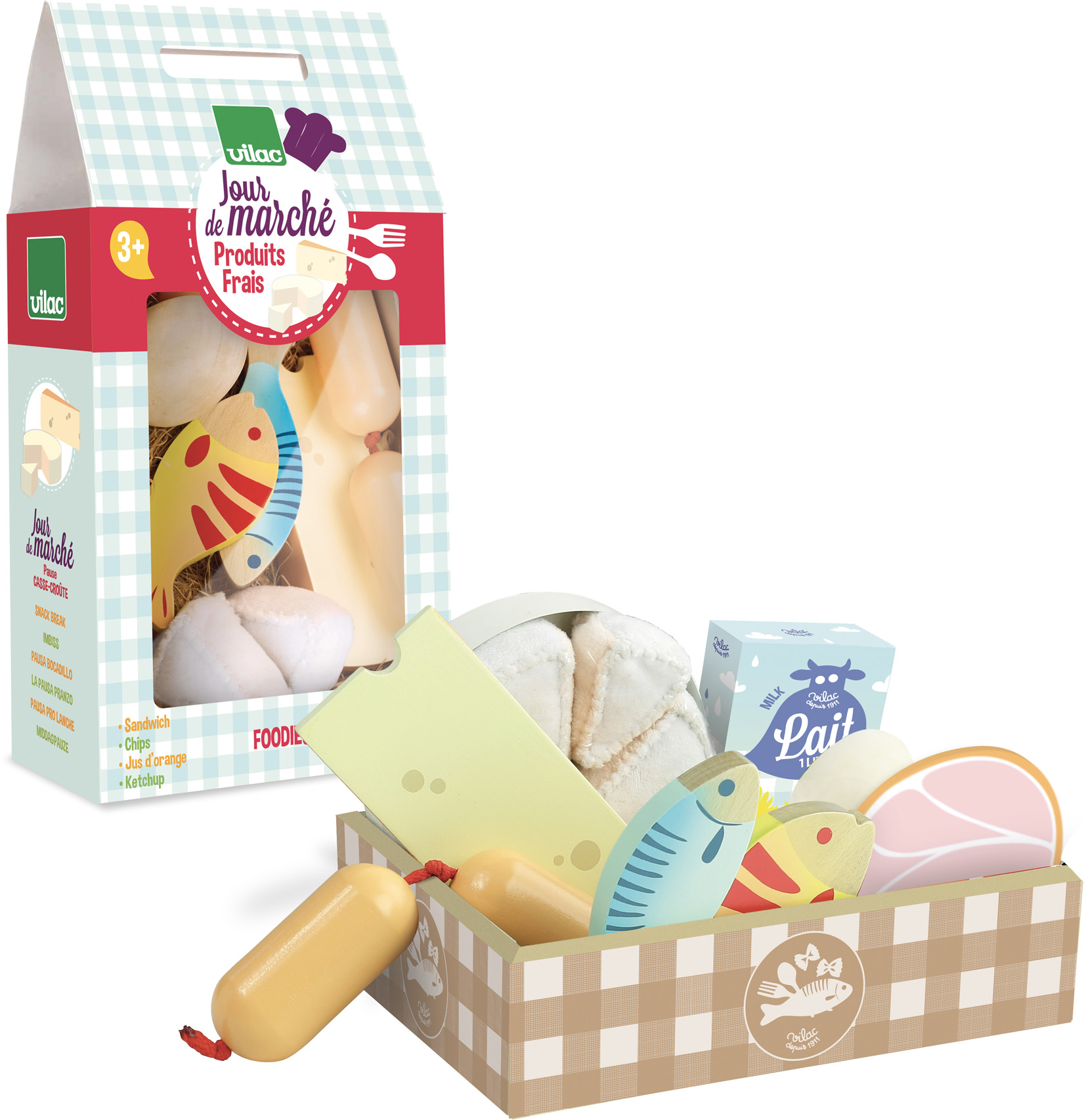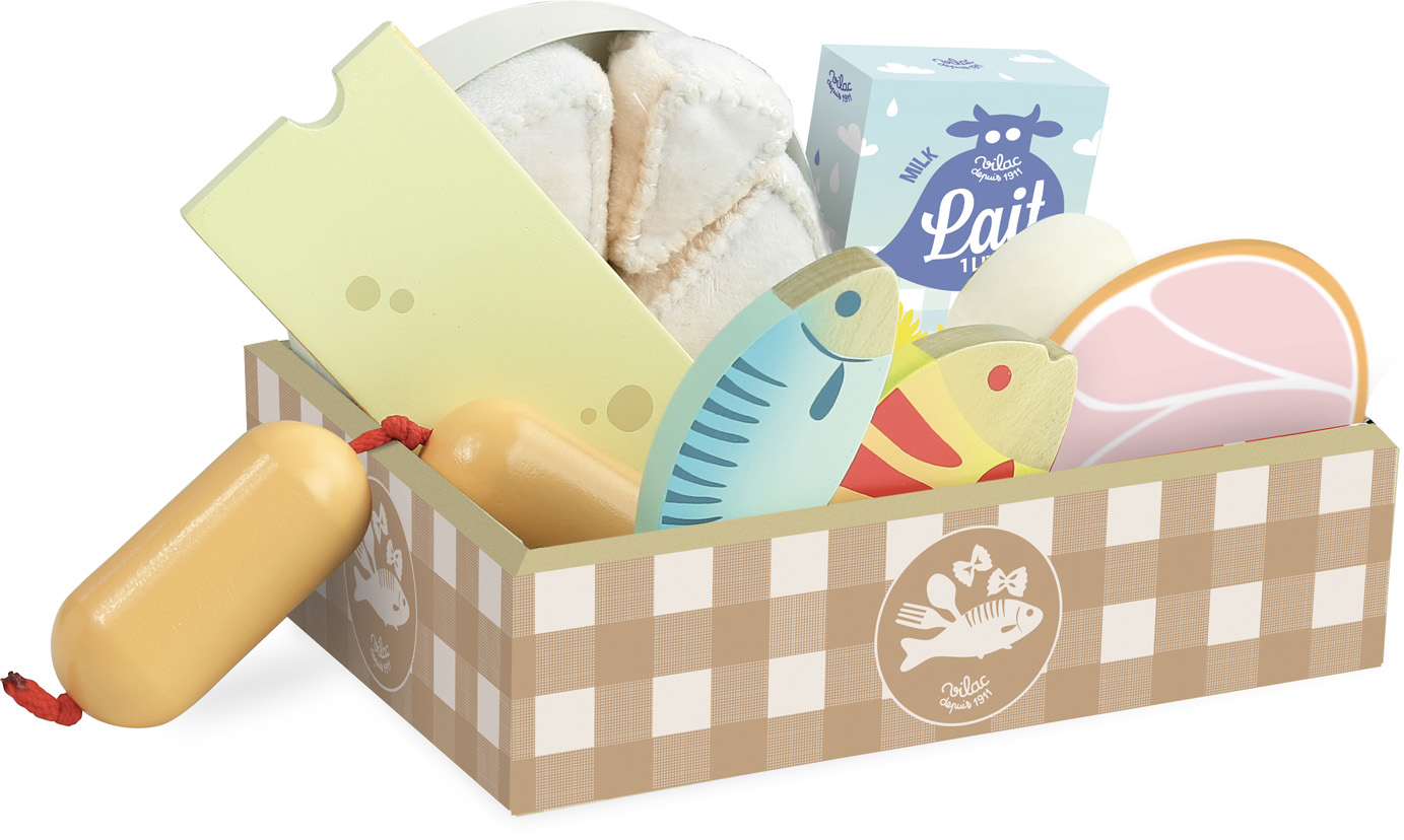 Pekný lepenkový box obsahuje 2 ryby, plátok šunky, vajcia, krabicu mlieka, syr a špekáčiky. Tento set je ideálním doplnkom do kuchyniek Vašich detí, 11 dielna sada. Hlavné vlastnosti: vhodné do každej kuchynepotraviny z drevaobsahuje 11 kusov