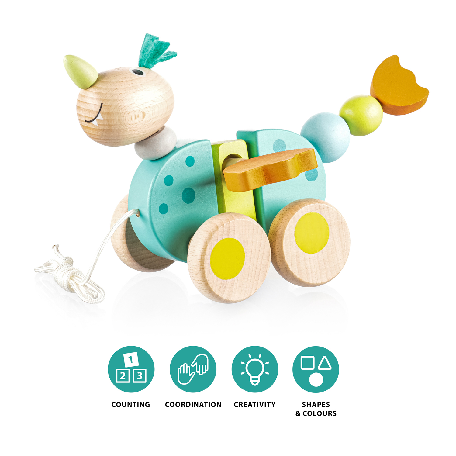 Drevený ťahací drak pre motiváciu k chôdzi. Vhodné pre deti od 16 mesiacov.