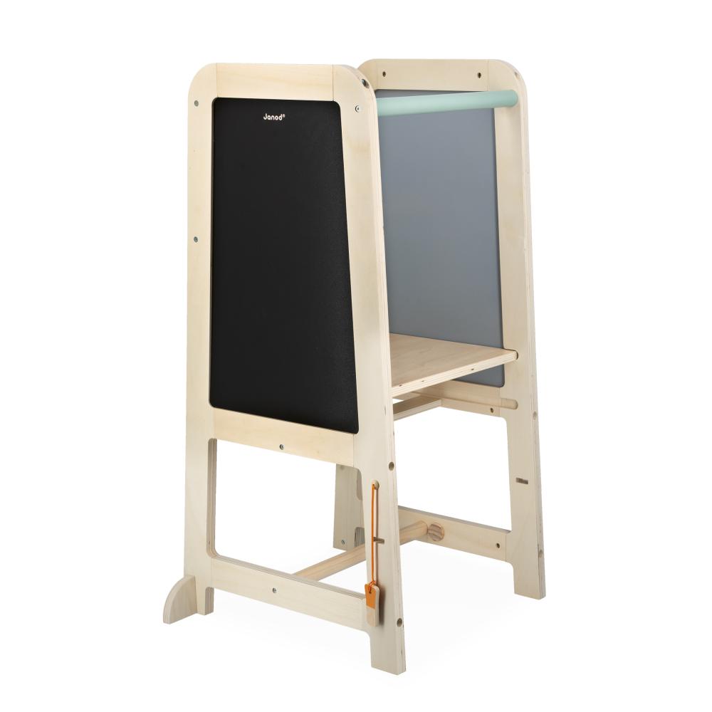 Objevte svět dospělých! Tato pěkná dřevěná rozhledna umožní vašemu dítěti dostat se do vaší výšky pro všechny každodenní činnosti: v kuchyni, před dřezem... a usnadní rozvoj jemných motorických dovedností, nezávislosti a interakce s ostatními. Věž roste s vaším dítětem díky 2 nastavitelné výšce (od 32,5 do 40,5 cm). Díky odnímatelné židli, která slouží jako krok, je také snadné. Může být připevněna k věži pro větší bezpečnost a snadno odstranitelné pro použití v celém domě. Kromě praktičnosti má věž také zábavnou stránku díky postranní desce, která nabízí skvělé příležitosti k hraní, kreslení nebo psaní nových receptů! Dodává se s 2 křídami a houbou. Pro děti od 18 měsíců.