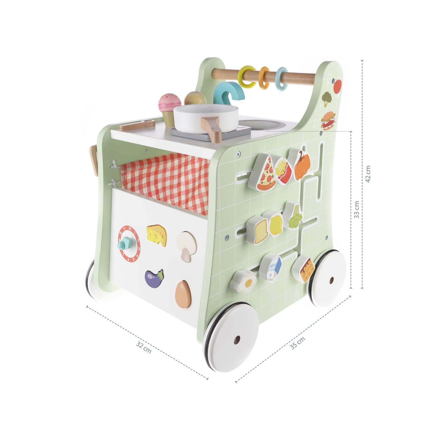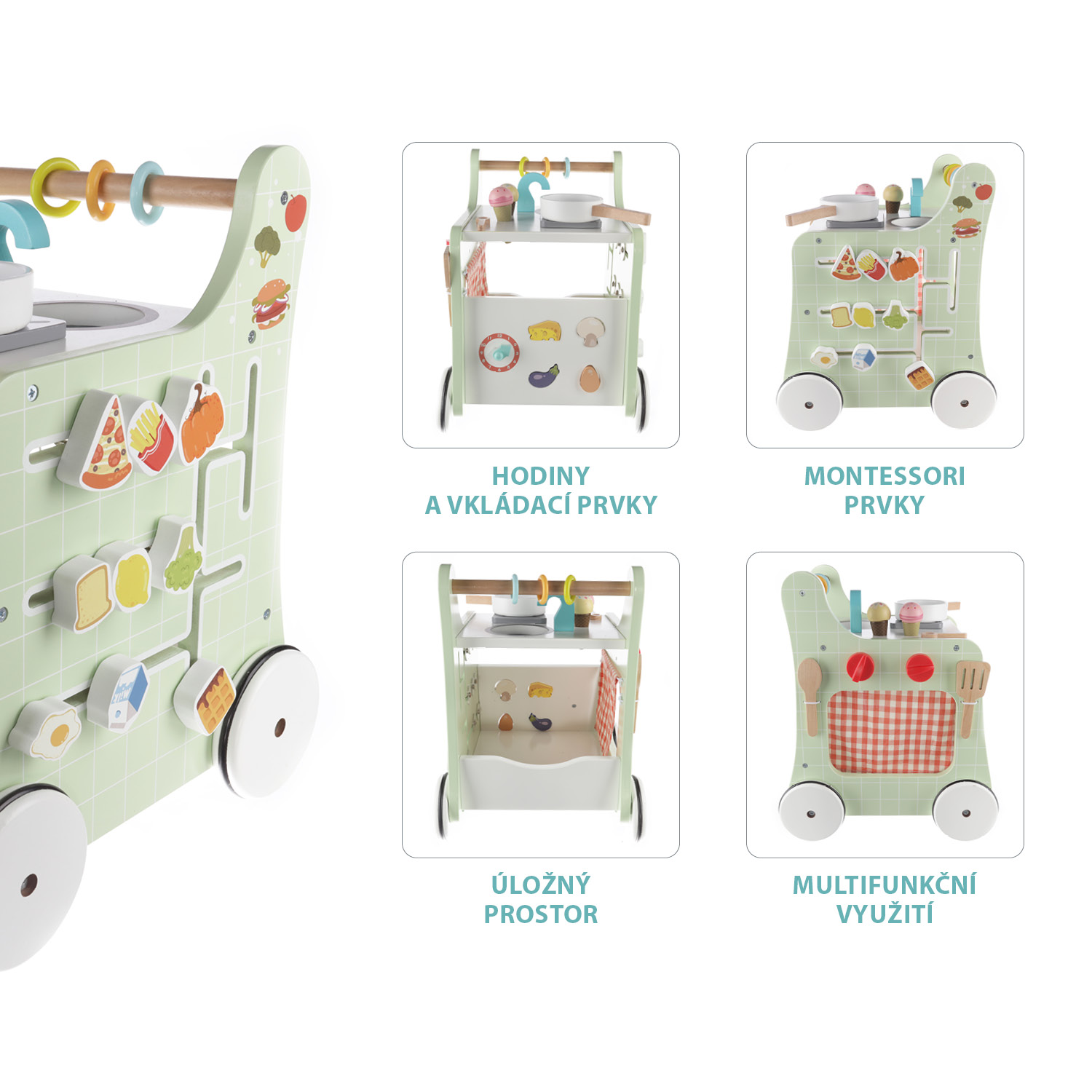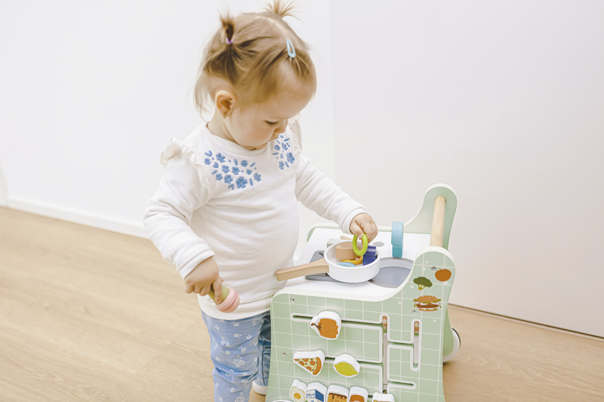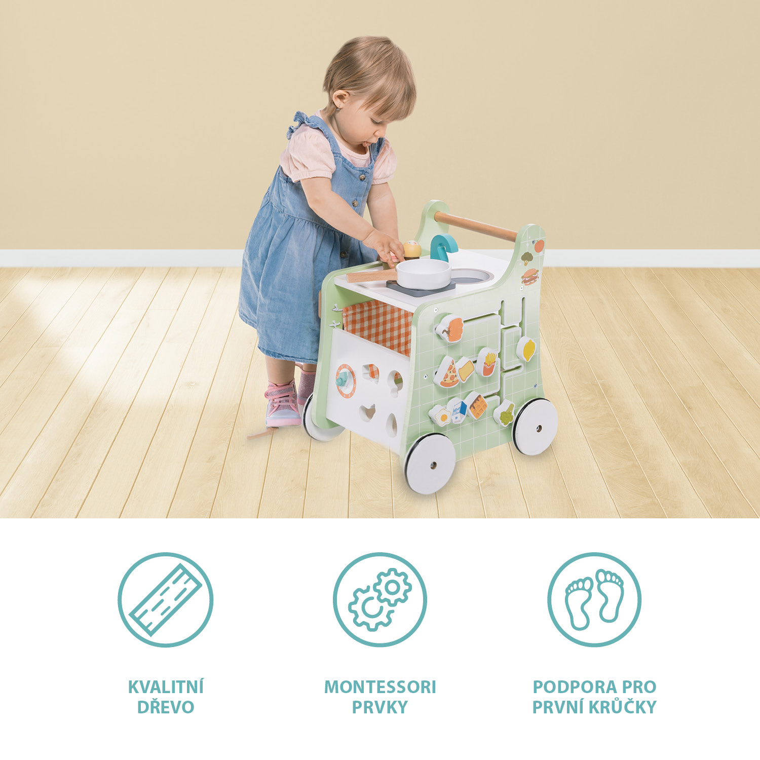 Roztomilé chodítko v tvare kuchynky bezpečne prevedie dieťa jeho prvými krokmi. Na udržanie rovnováhy sa používa drevená rukoväť, ktorej sa dieťa môže držať. Štyri tiché kolieska potom pomáhajú pri učení stability a prvých krokov.Hračka pre začínajúcich kuchárov