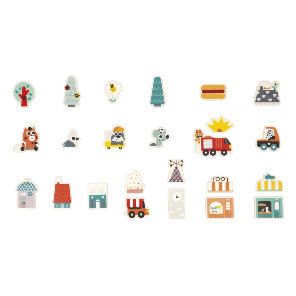 Přijďte si vybudovat vlastní město! Mladí stavitelé mohou postavit věž, brýle nebo obchod s obuví nebo domy... nebo možná zmrzlina nebo sendvič s potravinami? Tato sada obsahuje 24 dřevěných magnetů, které se drží magnetických desek nebo jakéhokoli jiného magnetického povrchu. Vaše dítě může při zábavě rozvíjet vaši představivost a dovednosti. Dřevěná magnetická hračka FSCTM. Pro děti od 2 let.