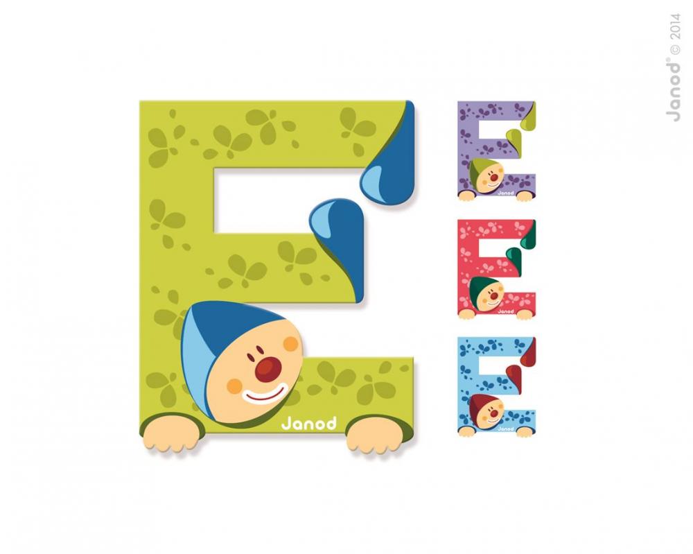 Dřevěné písmeno E Janod s nálepkou, krásná dekorace na dveřích nebo zeď. Vyberte si klaun písmen E ze 4 barev: zelená modrá fialová růžová a napište výběr do pořadí. _x000d_ Cena je za 1 kus.
