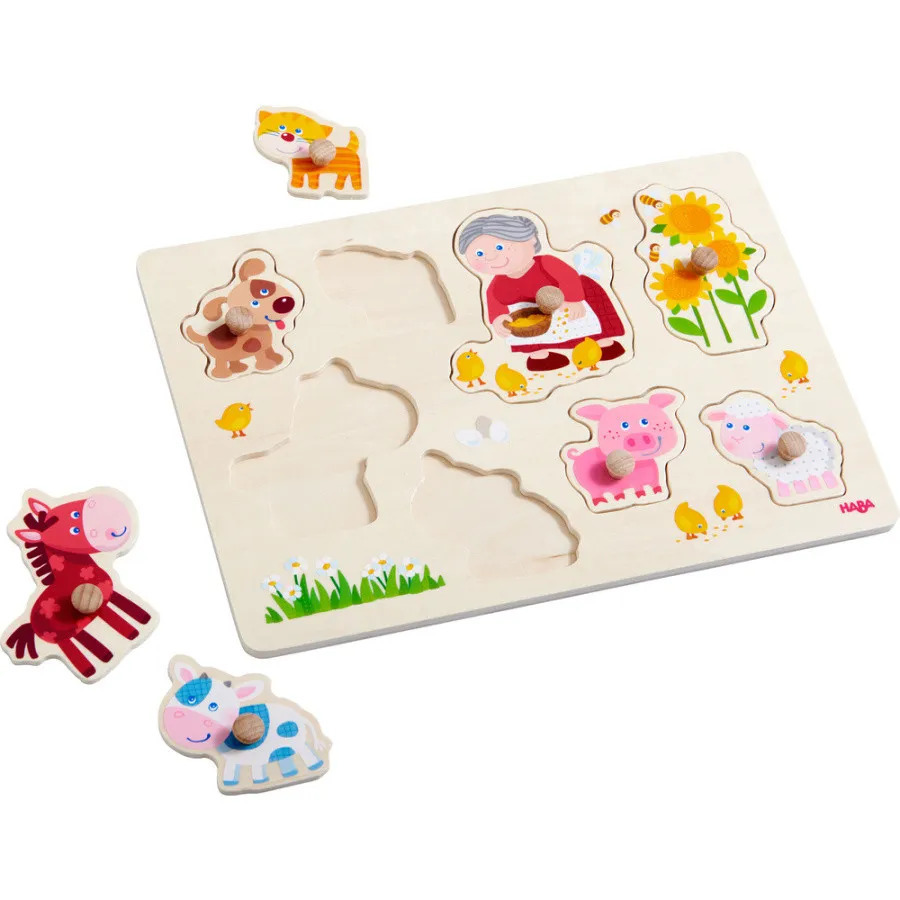Drevené vkladacie puzzle pre deti od 12 mesiacov podporujú rozvoj jemnej motoriky a učia deti spoznávať zvieratká. Na hraciu dosku je potrebné správne vložiť 8 častí. Kam patrí kôň, ovca alebo psík? Jednotlivé dieliky skladačky majú veľké úchytky, ktoré deťom uľahčujú manipuláciu.