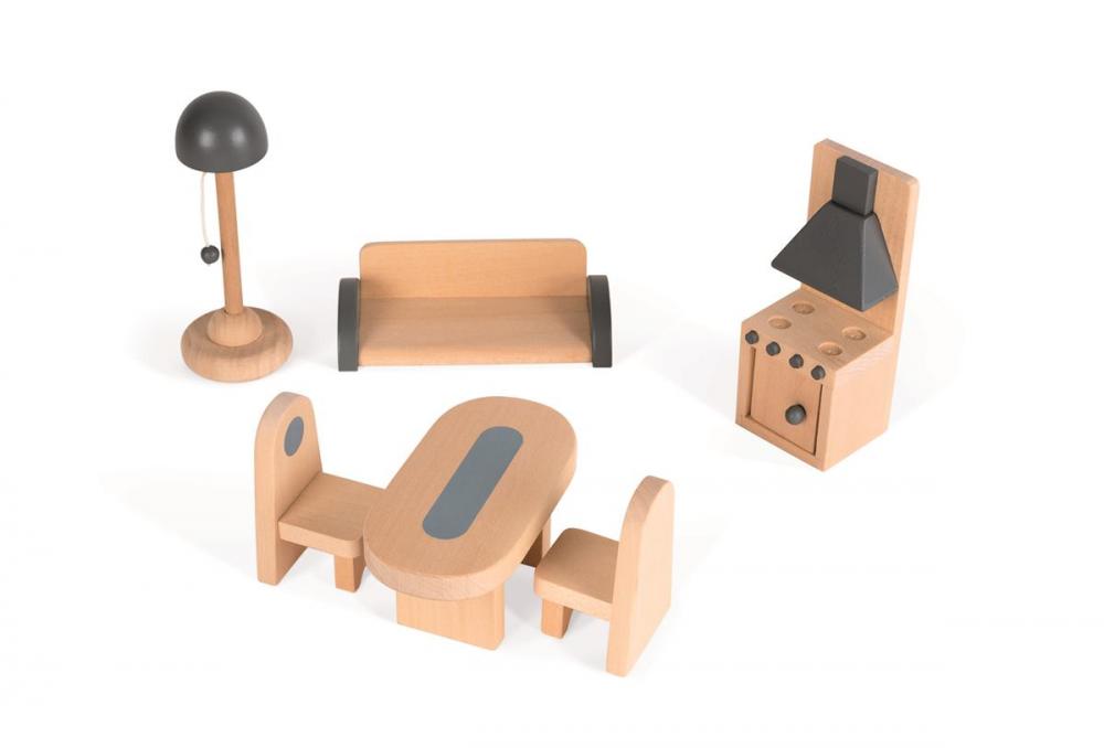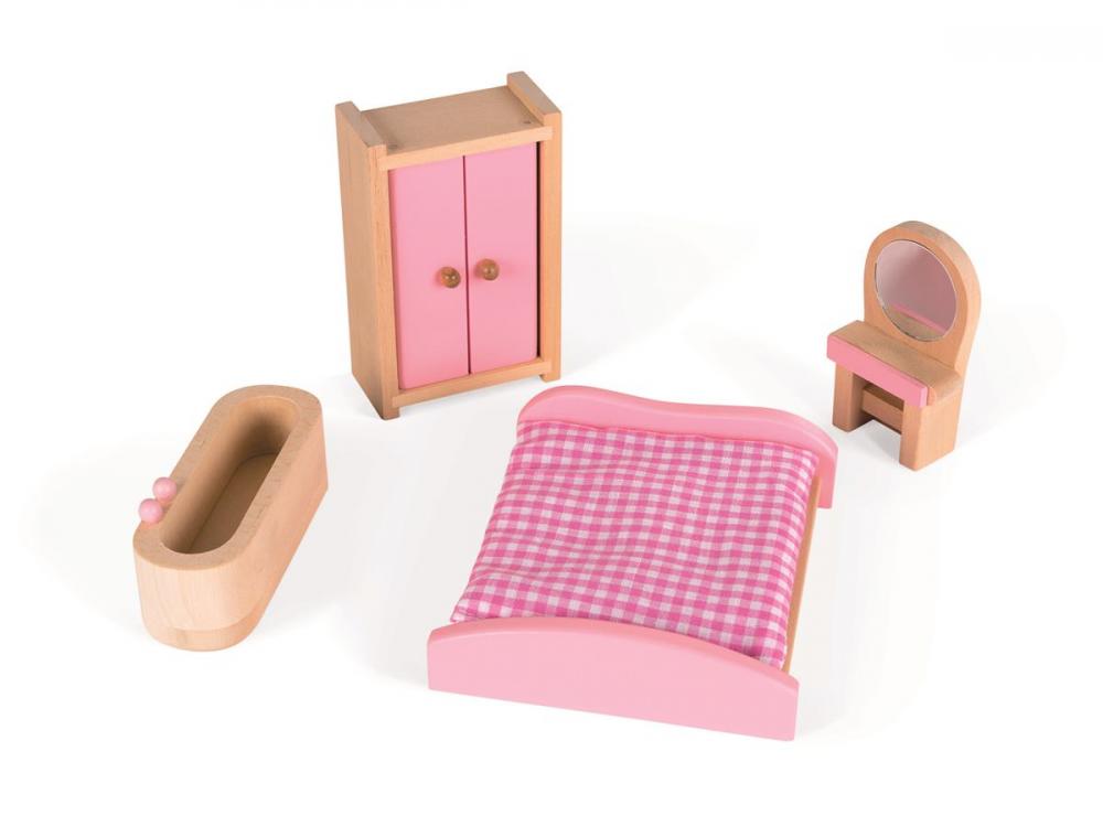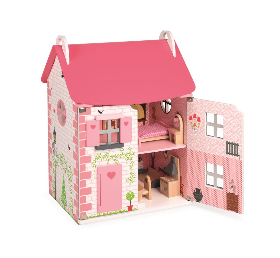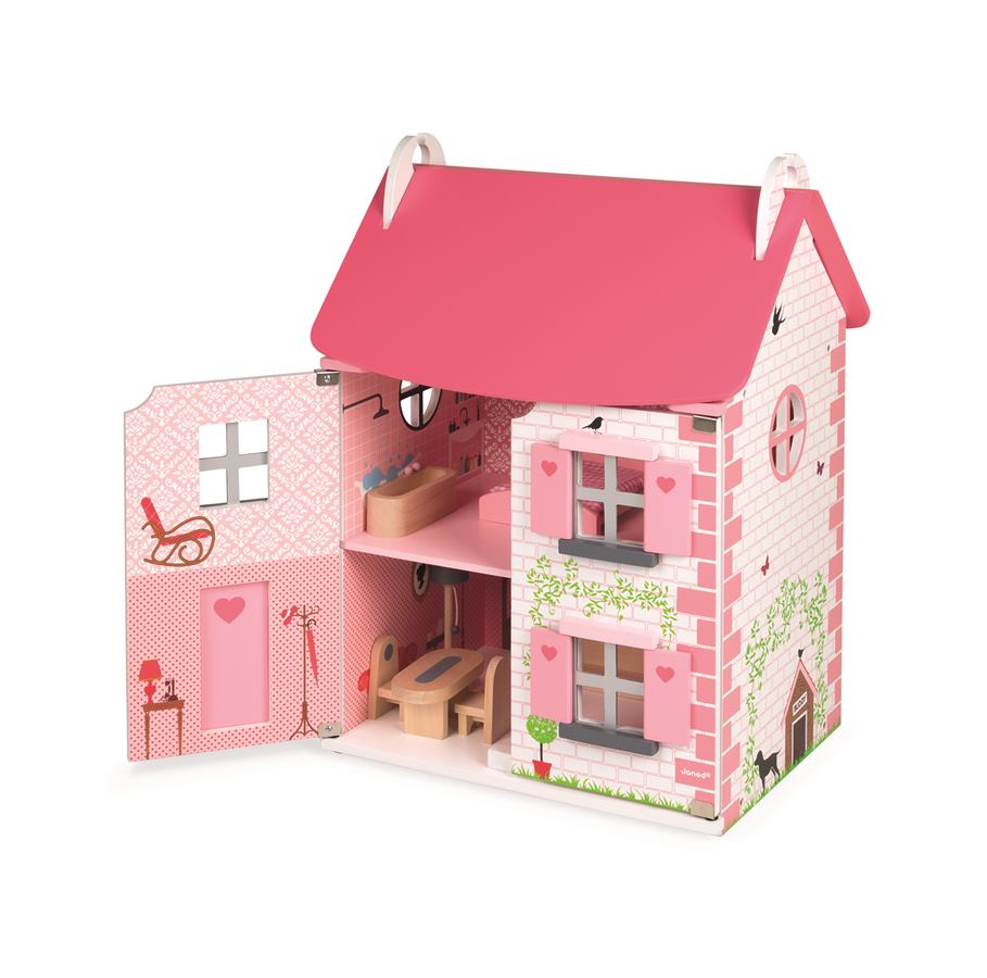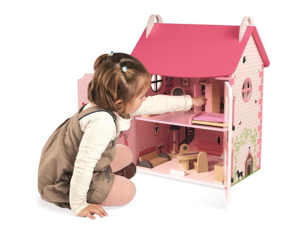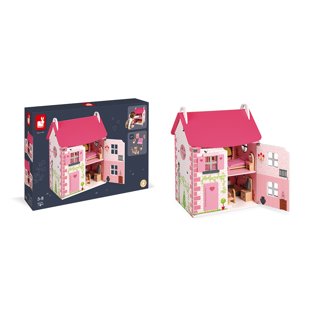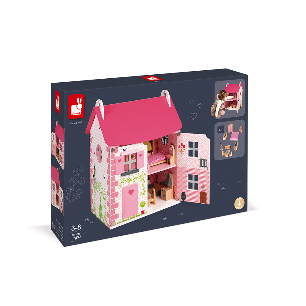Domeček pro panenky Mademoiselle ze dřeva je krásný domeček na hraní. Součástí domečku je až 11 doplňků, které tvoří dřevěný nábytek do ložnice, kuchyně, koupelny a obývacího pokoje. Domek má otevírací přední stěnu, která po otevření odhalí stylové pokojíčky uvnitř domu. Odpojitelná je i růžová střecha domku, přes kterou se malá výmyselníčka dostane na první patro domku. Fasádu domku zdobí imitace cihel, stromky, lampy, bouda s pejskem, ptáčky a motýlky. Celý design působí něžně a dívčí, zamiluje si ho každá malá princezna. Francouzský design je typický jemnými detaily, dokonalým propracováním a originalitou. Všechny tyto vlastnosti se spojují i v dřevěném domku Mademoiselle. Vnitřní stěny domku jsou ozdobeny vzorovanými tapetami a nábytkem. Součástí domku je dřevěný nábytek do kuchyně, který sestává z lampy, jídelního stolu se dvěma židlemi, sedačky a sporáku s digestoří. Ložnici si mohou holčičky zařídit postelí, skříní, toaletním stolkem a vanou, které jsou také součástí domku. Vhodné pro děti: od 3 - 8 let Rozměr: 41 x 30 x 54 cm