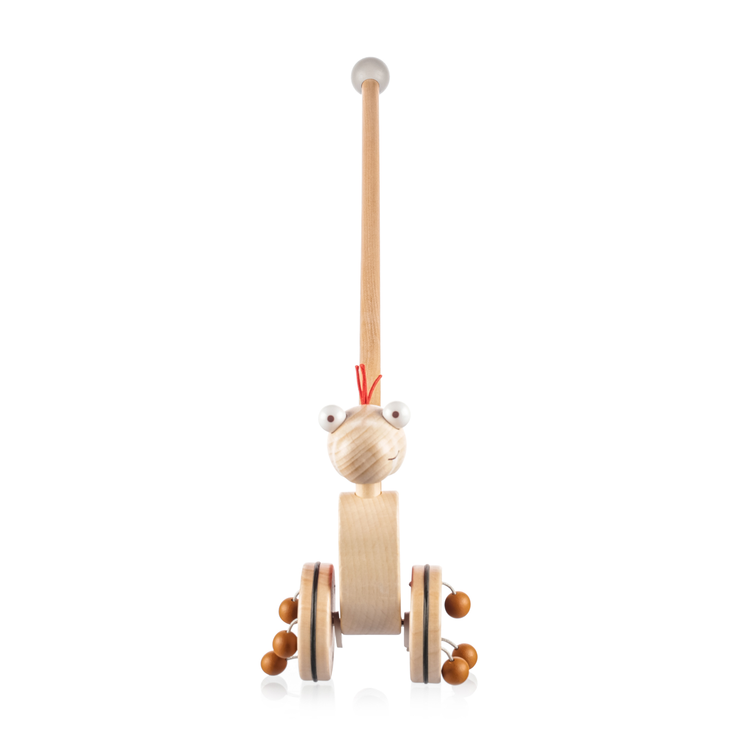 Jazdec na tyči je ideálna hračka pre deti, ktoré začínajú chodiť. Zábavný dinosaurus na dlhej tyči sa pri pohybe otáča a vďaka dreveným korálkam pripevneným ku kolieskam vydáva zvuk, ktorý dieťa láka k chôdzi a zabaví ho na celé hodiny. Robustná tyč slúži aj ako opora pri prvých krôčikoch dieťaťa a na konci je vybavená drevenou guľou pre väčšiu bezpečnosť. Posuvník nemá ostré hrany a je vyrobený z odolného dreva s dlhou životnosťou.