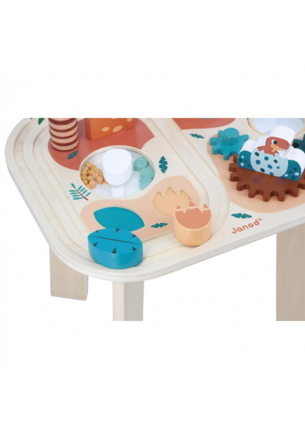 Vraťte se do času dinosaurů a nechte své dítě ponořit do živé atmosféry s tímto velkým motorickým stolem s činnostmi. Triceratops cestuje po svém okruhu, prochází pod sopkou a dotýká se zvonku, který začíná „zakřivit“. VAROVÁNÍ! Sopka exploduje! Kouř můžete okamžitě poznat díky plstění a pultu. Na druhé straně malý pteranodon letí z jednoho konce sopky k druhému, doprovázený 10 dřevěnými korálky. Hned vedle sopky je dlaň, která je třeba znovu a znovu rozkládat. Na druhé straně stolu je vejce T-Rex založeno na jeho třech rychlostech. Je něco skrytého pod dopisem? A pod stezkou? Okamžitě máte 2 masivní kusy. Co se stane, když otočíte vejce? Hluk, zábava, všechno se točí a točí! Balíček je doplněn otočným zkreslením zrcadlem zaručujícím smích. Celkem má stůl 8 aktivit po dlouhé hodiny hraní. Vaše dítě se bude moci pobavit při rozvoji jejich dovedností a představivosti. Vzdělávací hračka FSCTM Wood. Výška zásobníku je 32 cm, aby bylo snazší dosáhnout i těch nejmenších. Motorový stůl s činnostmi pro děti od 12 měsíců.