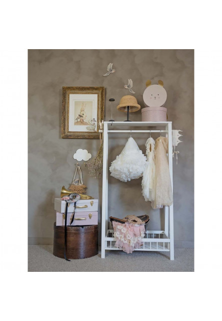 Zde si vaše dítě může pověsit své oblíbené oblečení. Na polici ve spodní části a nad ním je dostatek prostoru na boty a příslušenství. Na spodní polici můžete umístit úložné boxy, na horní boty, na bok stojanu se dají zavěsit kabelky i náhrdelníky.