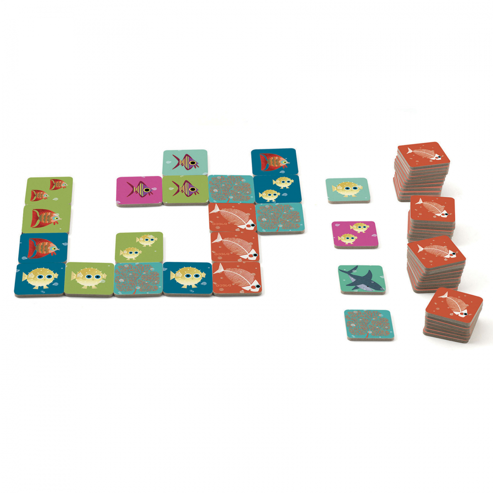 Obsah: 104 kartičiek: 64 rýb, 22 koralov, 8 žralokov, 10 chobotníc; 4 doštičky s obrázkom ryby.