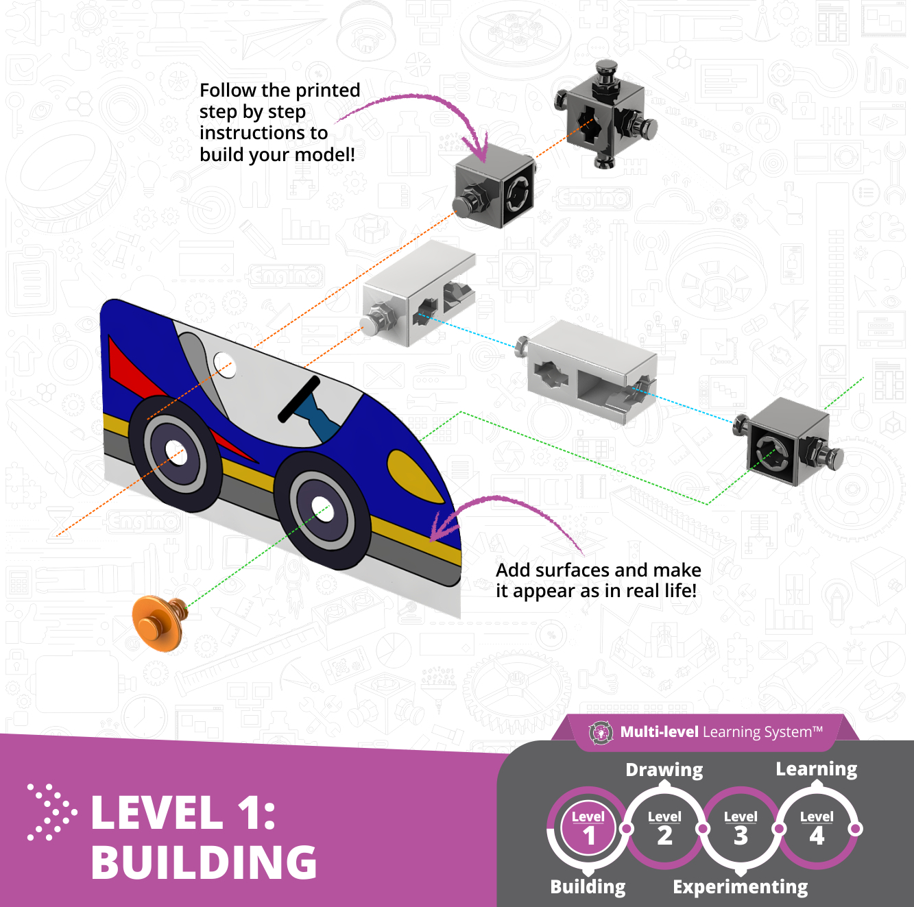 S touto súpravou vedy o zotrvačnosti a konverzii energie sa deti učia, ako funguje zotrvačnosť a ovplyvňuje náš každodenný život, skúmaním mechaniky jedného z najdôležitejších vynálezov 20. storočia: bezzpečnostného pásu. Keď skončia experimentovanie, deti si môžu vziaťfarebné ceruzky a ozdobiť si svoje vlastné výtvory. Navyše, mladí študenti dostanú farebnú brožúru s: mikrohistóriou Newtonových zákonov a teóriou, ktorá sa za nimi skrýva, zábavnými experimentmi v oblasti STEM s ich vlastným zariadením na testovanie nárazov, kvízom, ktorý otestuje ich pochopenie kľúčových pojmov STEM postupujte podľa pokynov na stavbu, vytlačiteľných vzhľadov, aby ste si precvičili svoje dizajnérske zručnosti Deti môžu stavať aj pomocou interaktívnej 3D aplikácie, ktorá je prvým krokom k návrhu funkčného modelu. Hračky Engino STEAM Labs sú kompletným vzdelávacím nástrojom STEAM určeným na prípravu mladých študentov na celoživotné vedecké objavy.
