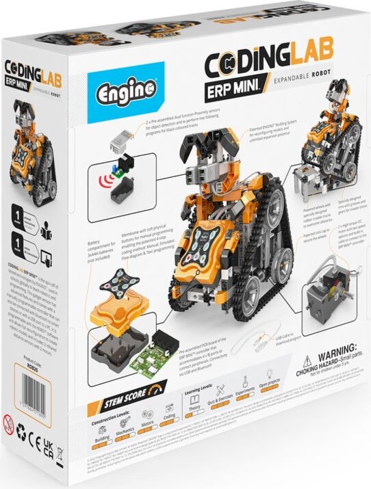 Robotická séria Engino sa nazýva „CODING LAB“. Produkty Coding Lab sú vhodné pre deti od 9 rokov a sú ideálne pre deti so záujmom o robotiku. Vďaka mnohým gadgetom a možnostiam prispôsobenia sú možnosti rôznych robotov nekonečné. Prostredníctvom praktických aktivít a výziev na riešenie problémov môže rad Coding Lab výrazne pomôcť ďalšej generácii vynálezcov rozvíjať ich zručnosti v oblasti STEM. Táto sada obsahuje robota ERP Mini, ktorý môže byť zostavený v dvoch rôznych modeloch ERP Mini sa používa v školách po celom svete na výučbu detí o robotike a programovaní. ERP Mini obsahuje manuálne programovateľný ovládač, ktorý je možné pripojiť cez Bluetooth k iným zariadeniam alebo cez USB k počítaču. ERP Mini je možné naprogramovať pomocou softvéru KEIRO. Robot obsahuje 2 infračervené snímače vzdialenosti a 2 motory. Wi-Fi a Bluetooth pripojenie Plastový materiál