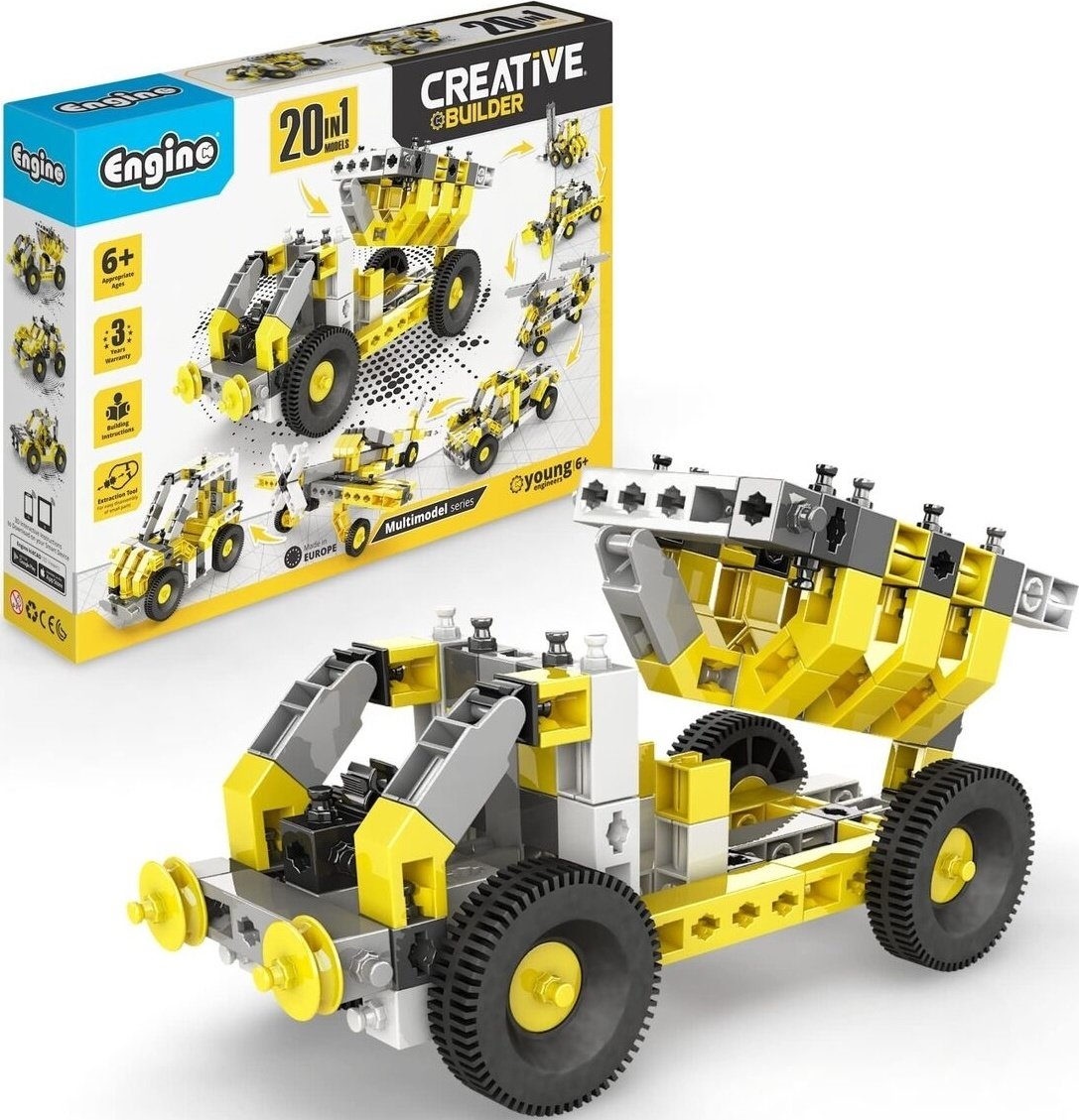 Táto stavebná hračka s viacerými modelmi posunie kreativitu dieťaťa do inej dimenzie. Skvelá modelová súprava pre začiatočníkov na objavovanie a záujem o STEM prostredníctvom kreatívneho stavebného prvku. Nová séria CREATIVE BUILDER - Multimodel je najnovšou inováciou veľmi úspešného radu INVENTOR 2017, ktorý prináša to najlepšie z ENGINO: schopnosť rýchlo a jednoducho postaviť čo najviac modelov! Ide o klasický stavebný systém, vďaka ktorému sú súpravy vhodné pre deti od 6 rokov, čo predstavuje odrazový mostík medzi líniami Qboidz a Mechanics. Rozvoj kreativity je hlavným zameraním tejto série, od 10 modelov až po 120 modelov! Všetky naše sady od 30 modelov a vyššie obsahujú nový 2-rýchlostný motor ENGINO pre animované stavby, od áut cez žeriavy až po dinosaury a helikoptéry. Jediným limitom je fantázia dieťaťa! Počet dielov v balení: 127 Pre vek 6+