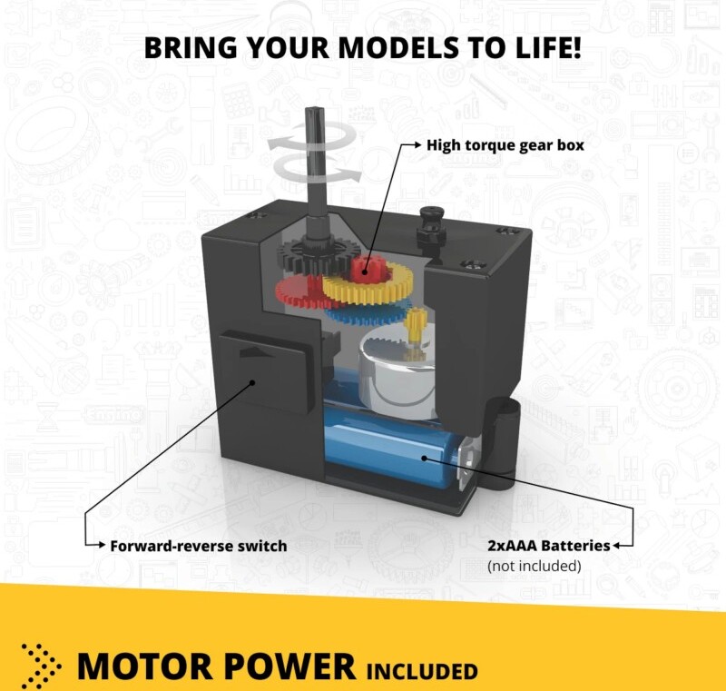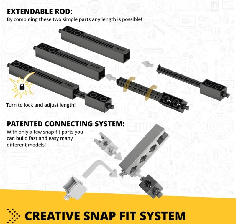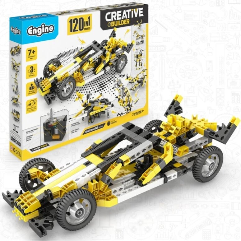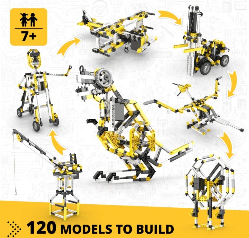 STAVEBNICA ENGINO INVENTOR 120 MODELOV MOTORIZOVANÝ SET je najväčšou sadou v produkcii ENGINO. Postaviť si môžeš 120 modelov všetkých tém pohybujúcich sa vecí ako lietadiel, motocyklov, áut, stavebných strojov a dokonca aj roztomilých zvierat Tvojej fantázii sa nebudú klásť žiadne medze a môžeš vytvoriť niekoľko lietadiel a stíhačiek, niekoľko formulí a dragsterov, veľké rýpadlá alebo Jeepy a dokonca aj kočíky či štvorkolky. Zaujíma ťa svet zvierat? Zostav si draka alebo tarantulu. Zaujímaš sa o mechaniku a ako veci fungujú? Potom tu nájdeš hojdačky, katapulty, kolotoče aj ruský bicykel. Máš rád prehistorické zvieratá? Postav si dinousaura alebo vtákoještera. Chceš spoznať Trójsku vojnu? Postav si pohyblivý model trójskeho koňa. A navyše, všetky modely môžeš oživiť alebo rozhýbať pomocou motorizovanej sady.