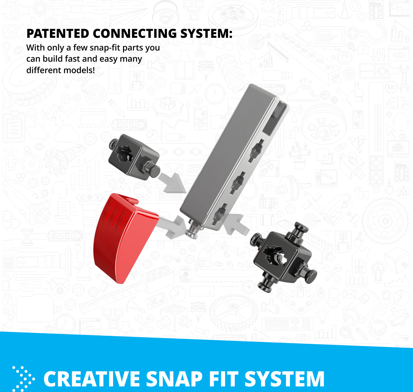 Séria INVENTOR MECHANICS má tematický prístup s možnosťou viacerých modelov a predstavuje pôsobivý hlavný model. K systému ENGINO® patria patentované komponenty, ktoré zvyšujú estetické aj technické vlastnosti. Medzi tieto časti patria vysoko precízne kolesá, mechanizmy a zaklapávacie zakrivené povrchy.