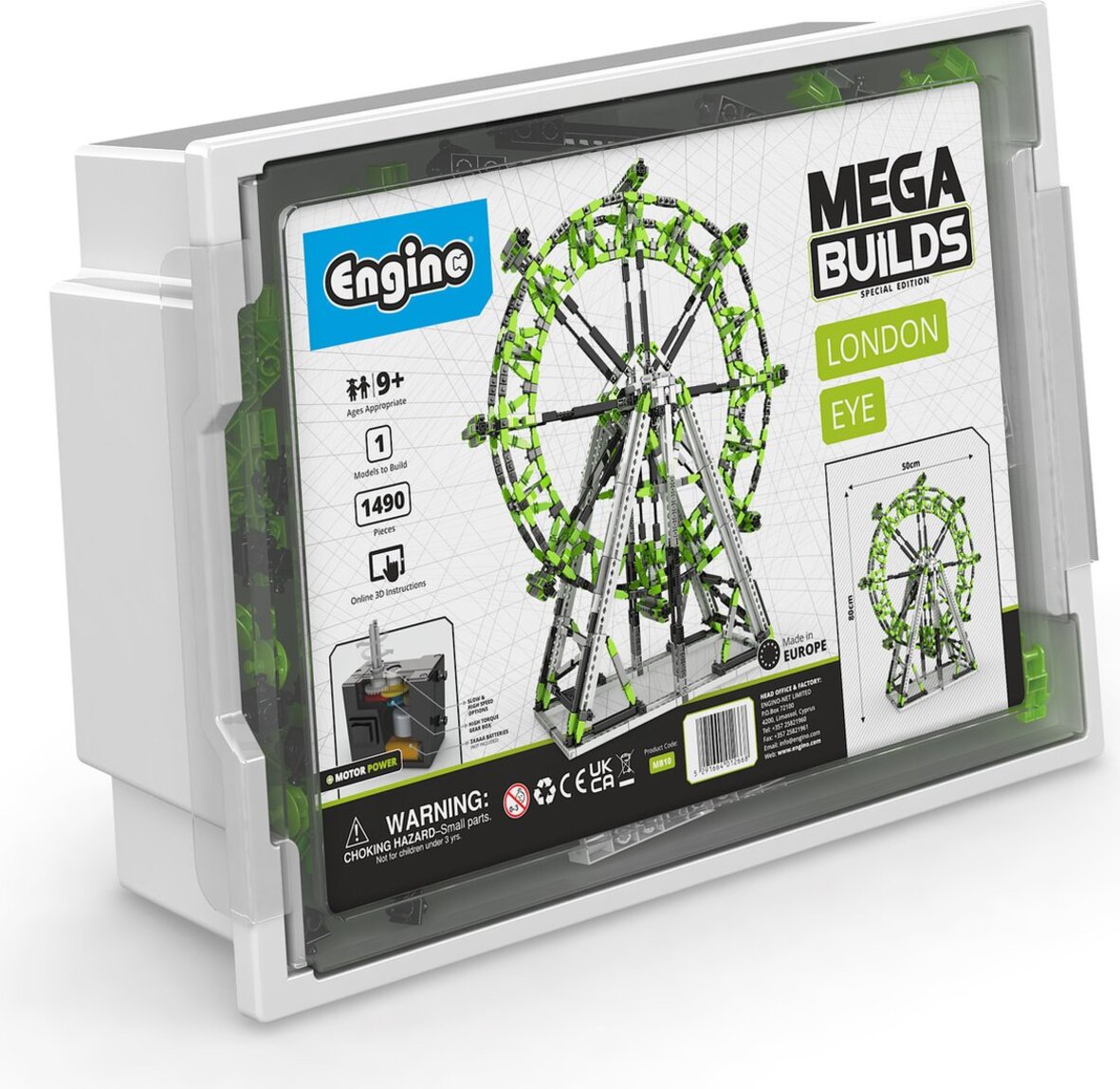 Rad Engino „Mega Builds“ dáva priestor deťom od 9 rokov na vytváranie masívnych konštrukcií z ich obľúbených budov alebo vozidiel. Súpravy Mega Builds sa dodávajú vo veľkej plastovej nádobe, aby bolo možné všetky diely po vytvorení konštrukcie opäť úhľadne uložiť. Vzhľadom na veľkosť a zložitosť modelov sú všetky návody na stavbu poskytované prostredníctvom bezplatnej stiahnuteľnej aplikácie. Táto sada obsahuje svetoznáme ruské koleso London Eye. sada obsahuje motor, ktorý dokáže ovládať London Eye. Po postavení je to gigant vysoký 80 cm a široký 70 cm. 1505 kusov Plastový materiál