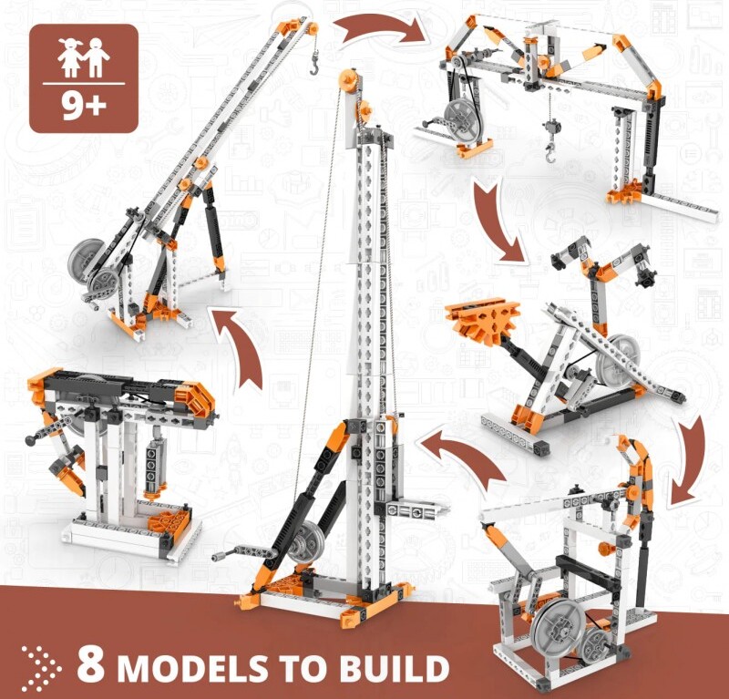 Zistite, ako sa dajú remenicové pohony použiť na prenos sily so zníženým trením a ako môžu zvýšiť silu alebo rýchlosť na úžasné úrovne. Kladky sa používajú už tisíce rokov a sú nevyhnutnou súčasťou zložitých strojov v modernej dobe, ktoré riešia mnohé technologické problémy. Postavte si 8 funkčných modelov, ako je vlek materiálu, stacionárny bicykel, žeriavový most, mixér, stavebný žeriav a veterný mlyn. Jednoduché pokyny na zostavenie všetkých modelov nájdete buď online, alebo v priloženej brožúre. Brožúra poskytuje podrobné vysvetlenie rôznych použitých vedeckých princípov a zahŕňa inovatívne experimentálne aktivity pre praktické učenie. K dispozícii je aj sekcia Kvíz, v ktorej môžete otestovať svoje novonadobudnuté vedomosti!