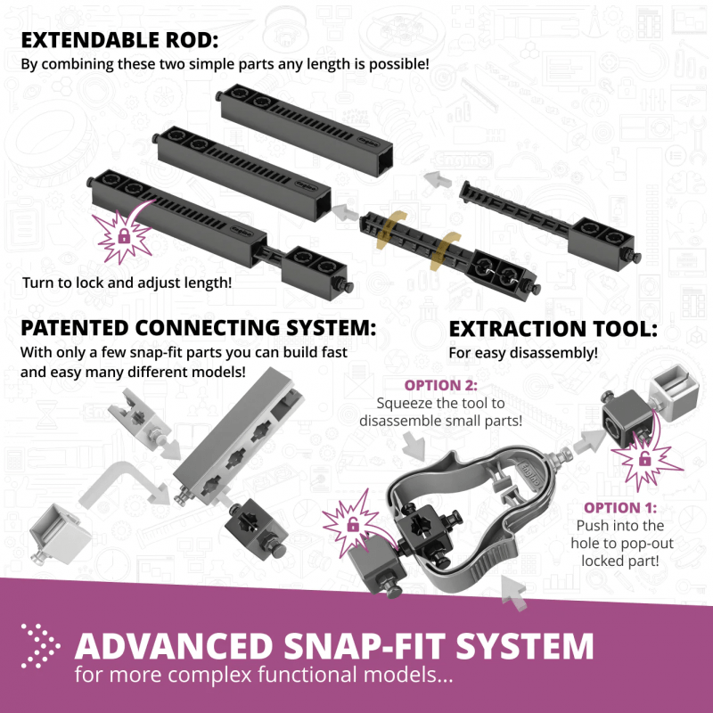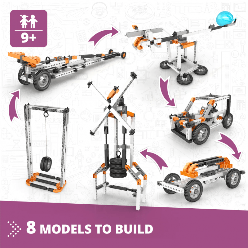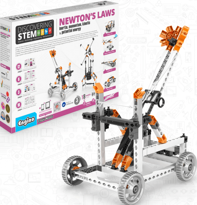 Dozviete sa všetko o Newtonových pohybových zákonoch, ktoré sú základom klasickej mechaniky, ktorá stále opisuje väčšinu každodenných životných situácií. Experimentujte s kinetickou a potenciálnou energiou, aby ste objavili vlastnosti energie a ako sa transformuje z jednej formy do druhej. Postavte si 8 funkčných modelov, ako je balistický katapult, gravitačný ventilátor, kolízne auto, pohyblivá kabína, lietadlo poháňané balónom a dragster. Jednoduché návody na zostavenie všetkých modelov nájdete buď online, alebo v priloženej brožúre. Brožúra poskytuje podrobné vysvetlenia rôznych použitých vedeckých princípov a zahŕňa inovatívne experimentálne aktivity pre praktické učenie. K dispozícii je aj sekcia Kvíz, v ktorej môžete otestovať svoje novonadobudnuté vedomosti!