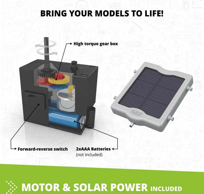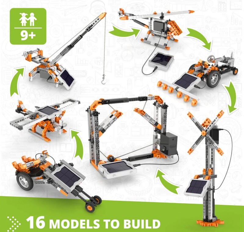 Klimatické zmeny a globálne otepľovanie vyzývajú vedcov, aby konali a zachránili našu planétu znížením emisií uhlíka. Slnko môže poskytnúť bezplatnú energiu pre všetky naše potreby, ale musíme ju premeniť na užitočnú formu. Táto sada obsahuje jeden 3V solárny panel, ktorý poháňa elektrický motor, spolu s návodom na 16 solárne napájaných modelov, ako je chopper auto, ventilátor, lietadlo, robot a navijak. Jednoduché pokyny na zostavenie všetkých modelov nájdete buď online, alebo v priloženej brožúre. Brožúra poskytuje podrobné vysvetlenia rôznych použitých vedeckých princípov a zahŕňa inovatívne experimentálne aktivity pre praktické učenie. K dispozícii je aj sekcia Kvíz, v ktorej môžete otestovať svoje novonadobudnuté vedomosti!