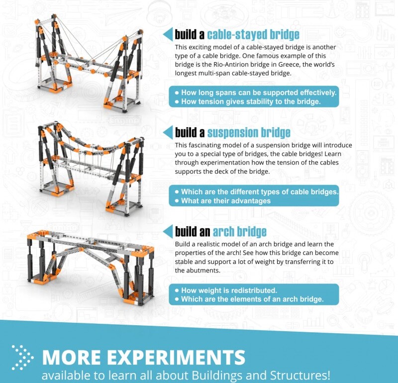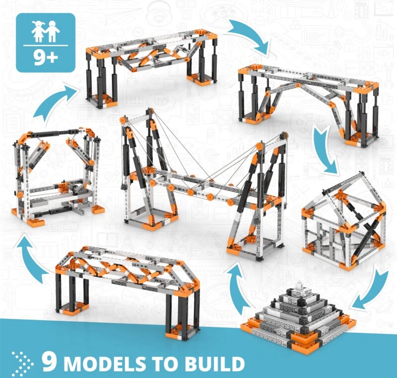 Vzdelávací montážny set. Vaše dieťa môže postaviť 6 modelov navrhnutých výrobcom a vymyslieť neobmedzené množstvo vlastných modelov. V priloženej brožúrke okrem návodu nájdete podrobné vysvetlenia rôznych vedeckých princípov pri práci v rôznych zostavených modeloch, ako aj inovatívne praktické príklady, ktoré si deti môžu vyskúšať a naučiť sa pri hre. K dispozícii je kvízová sekcia, kde si deti môžu otestovať a upevniť svoje nové vedomosti!