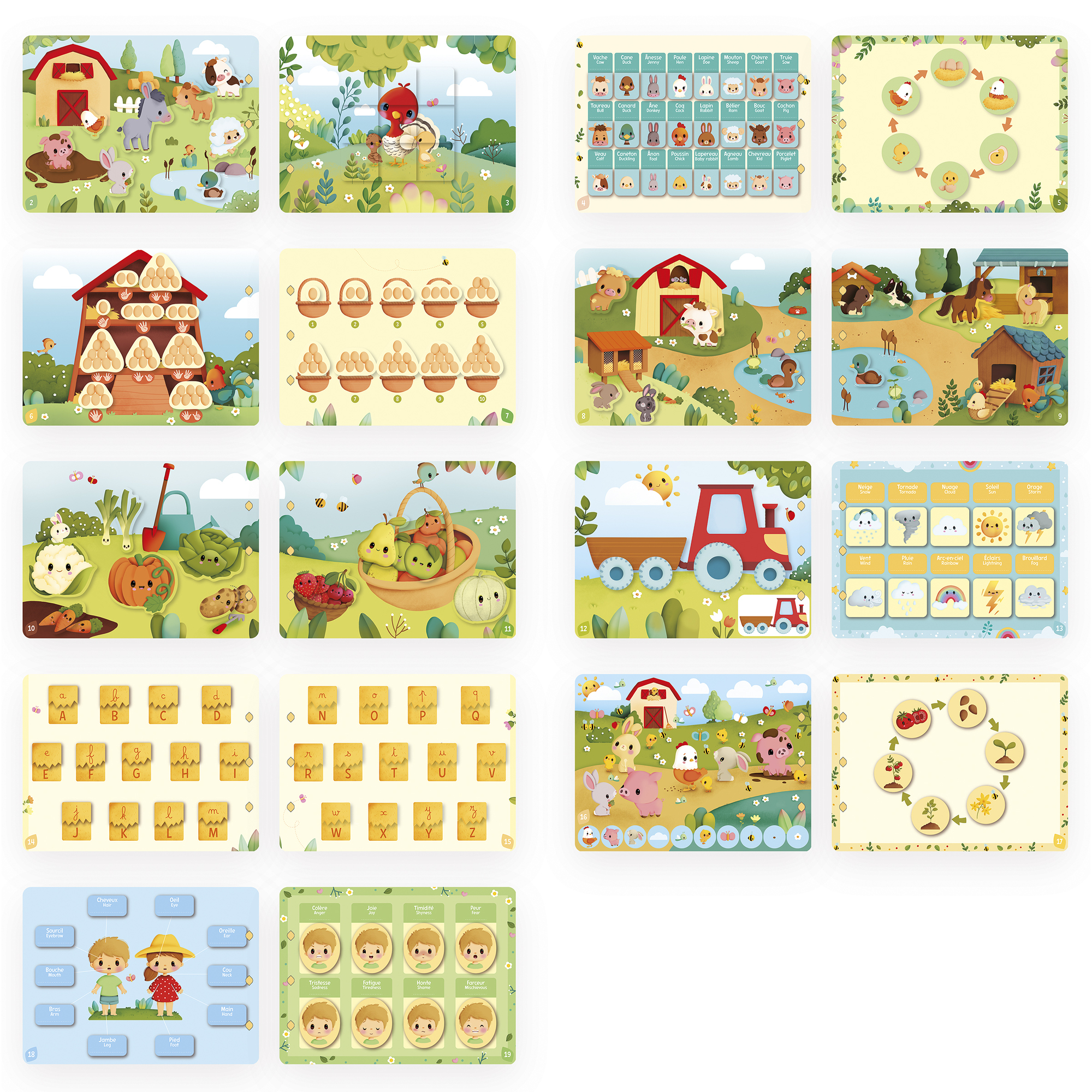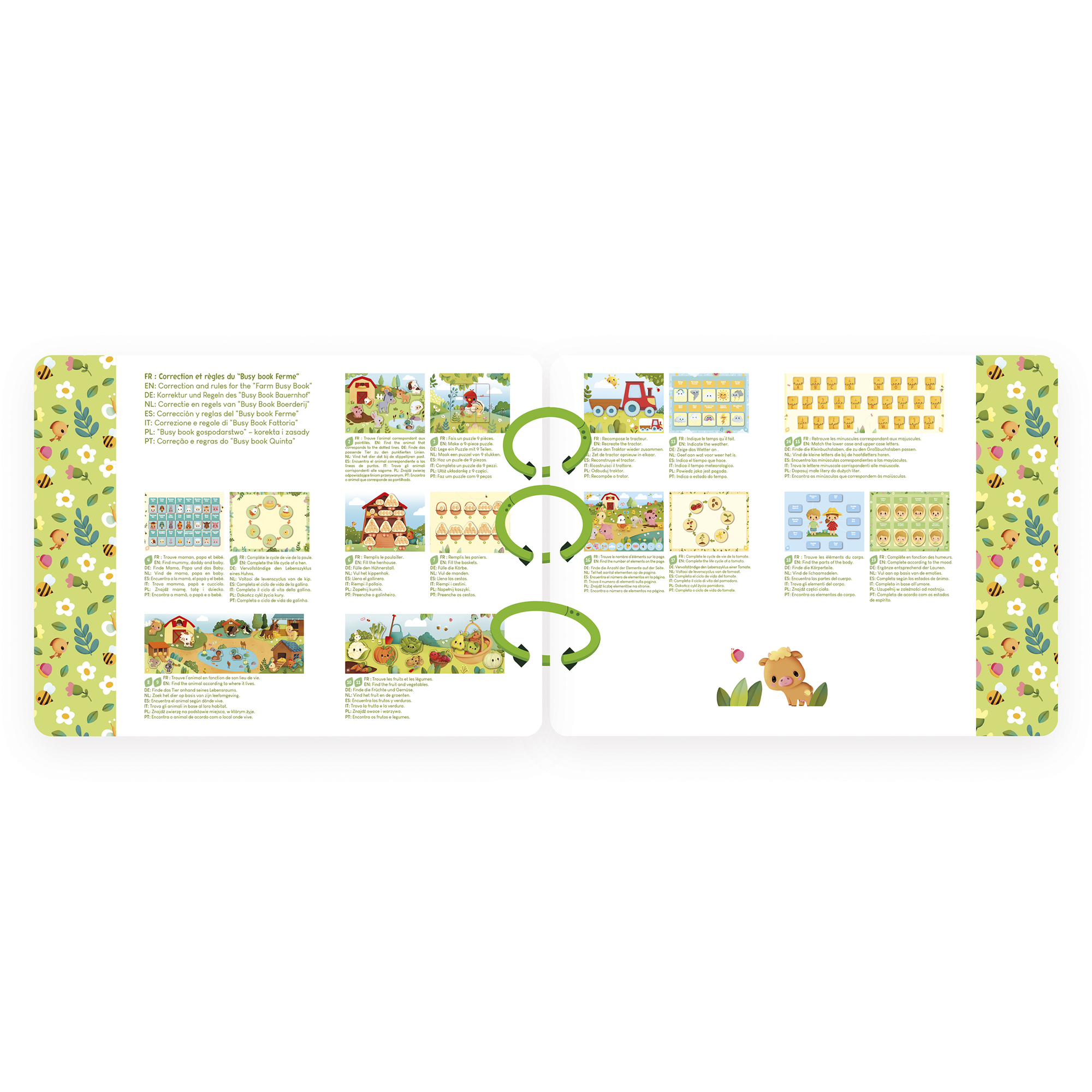 Rozvíjajúca sa kniha s tematikou farmy, dodávaná v atraktívnej darčekovej krabičke. Obsahuje 20 strán zábavných aktivít so 158 prvkami, ktoré je možné umiestniť dovnútra. Batoľatá objavia hospodárske zvieratá a ich biotopy, životný cyklus sliepky, ovocie a zeleninu zo záhrady... a staršie deti sa zabavia učením čísel a abecedy (veľké a malé písmená). 3 odnímateľné plastové krúžky umožňujú rodičom prispôsobiť vnútro knihy výberom strán vhodných pre vek dieťaťa. Rozvíja jemnú motoriku a celkové učenie. Kniha vyrobená z kartónu FSCTM pre deti od 3 rokov.