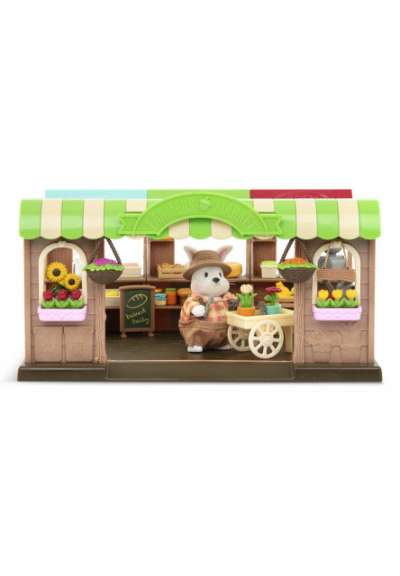 68-dílná sada obsahuje obchod, 2 přepravky, 2 bloky ledu, 2 kbelíky, 2 trsy krevet, 3 modré ryby, 3 žluté ryby, 3 košíky s ovocem a zeleninou, 2 tácky na zeleninu, 2 jablka, rajče, pomeranč, 2 papriky, 2 hrušky, mrkev, kukuřičný klas, květák, svazek banánů, svazek hroznů, meloun, dýně, přepravka zeleného hrášku, přepravka borůvek, přepravka malin, potravinářská váha, skupina malých konzerv, velká konzerva, láhev mléka, kolečko sýra, sklenice arašídového másla, sklenice medu, sklenice jahodového džemu, velká sklenice, malá sklenice, tác s vajíčky, 2 rostliny v malých květináčích, rostlina ve velkém květináči, stojan na květináč, konev, nůžky, malá lopatka, hrabičky, nákupní košík, bageta, kulatý chléb, bochník chleba, 3 muffiny, stojací cedule, uvítací cedule, nákupní vozík s odnímatelným nákupním košíkem. Postavičky zvířátek Li'l Woodzeez se prodávají samostatně.