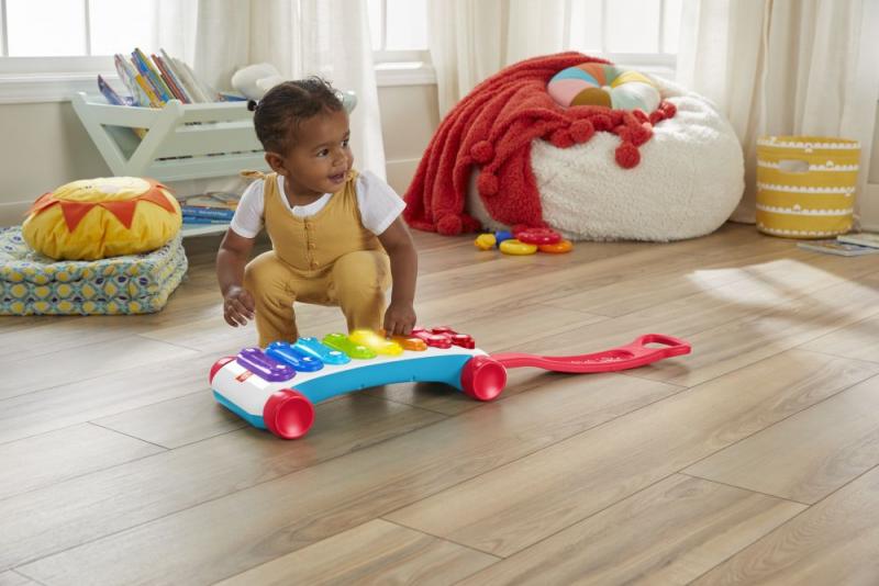 Ikonický klasický xylofón vo zväčšenej veľkosti od Fisher-Price® má dva režimy hry. Stlačením 8 svietiacich tlačidiel aktivujú deti obsah, ktorý učí abecedu, čísla, tvary a prvé slová. Pretože sa každé dieťa vyvíja inak rýchlo, podporuje hračka technológiu Smart Stages™, vďaka ktorej môžete zvoliť takú úroveň obsahu, ktorá je pre vaše dieťatko práve najvhodnejšia. Vybrať môžete medzi tromi úrovňami výukového obsahu. Druhý režim hry ponúka deťom zábavnú hru na ťahanie, kedy deti môžu ťahať xylofón za sebou za rukoväť. Rukoväť sa dá sklopiť pod hračku pre pohodlnú hru v sede.