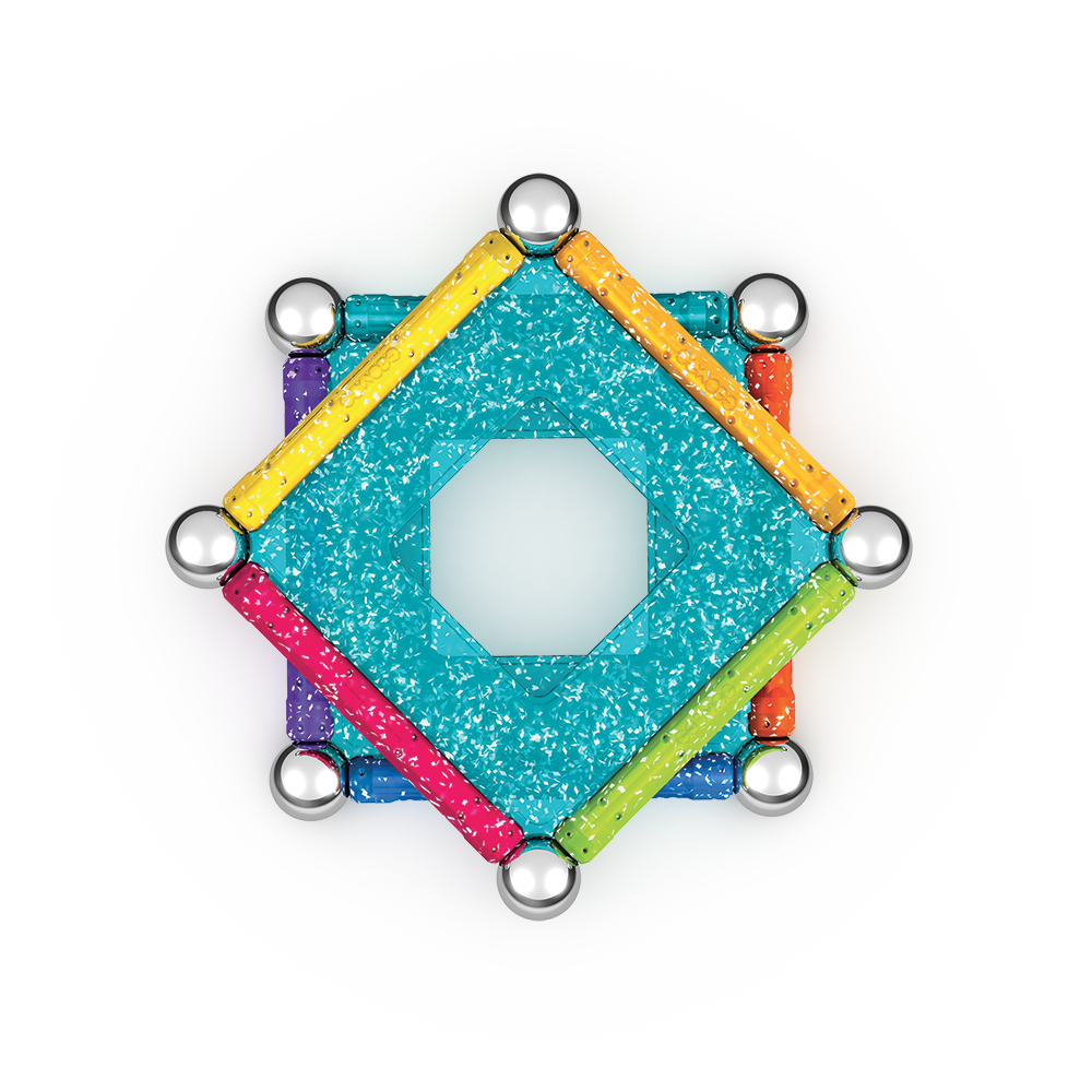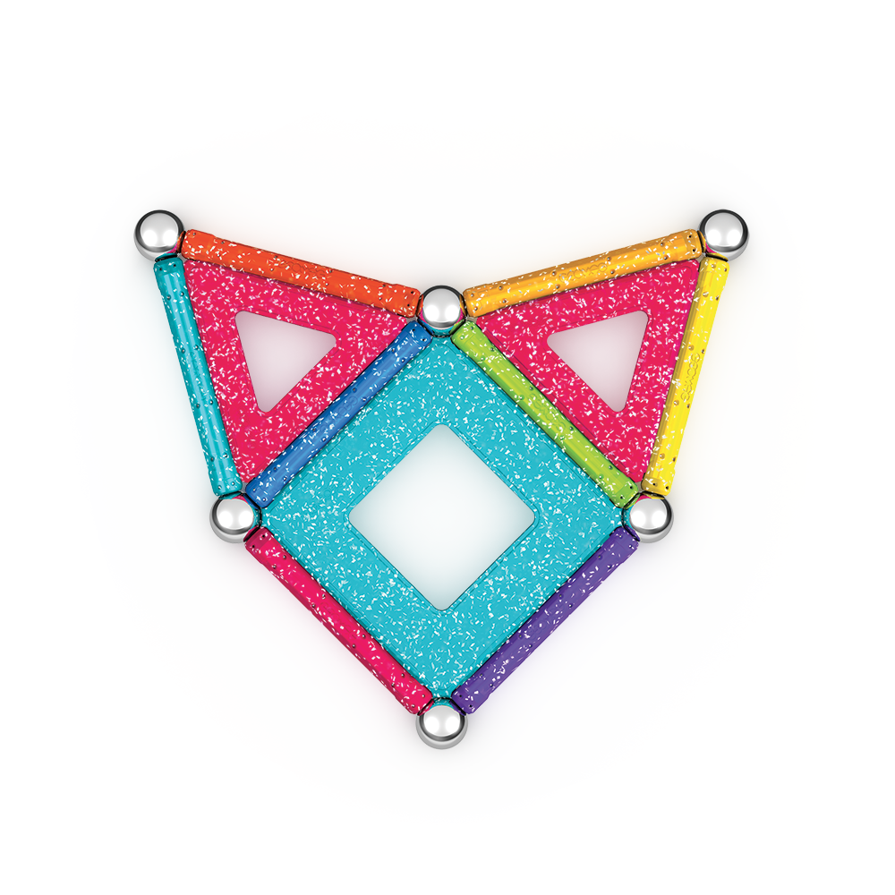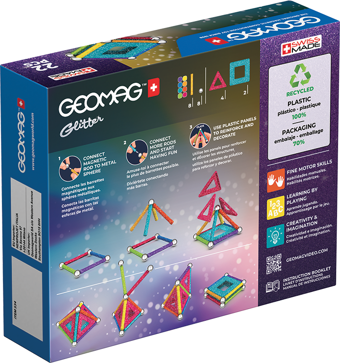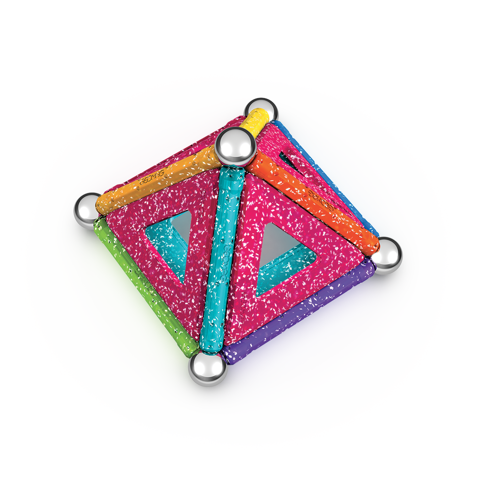Magnetická stavebnice Geomag obsahující v tyčkách i výplních unikátní třpytky. Stavebnice je určena pro děti od 3 let a je ze 100% recyklovaného plastu. Stavebnice obsahuje celkem 22 dílků – 8 magnetických tyček, 8 ocelových kuliček, 4 červené trojúhelníkové výplně a 2 modré čtvercové výplně. Kromě kuliček obsahují všechny součástky, včetně plastového pouzdra, třpytky.